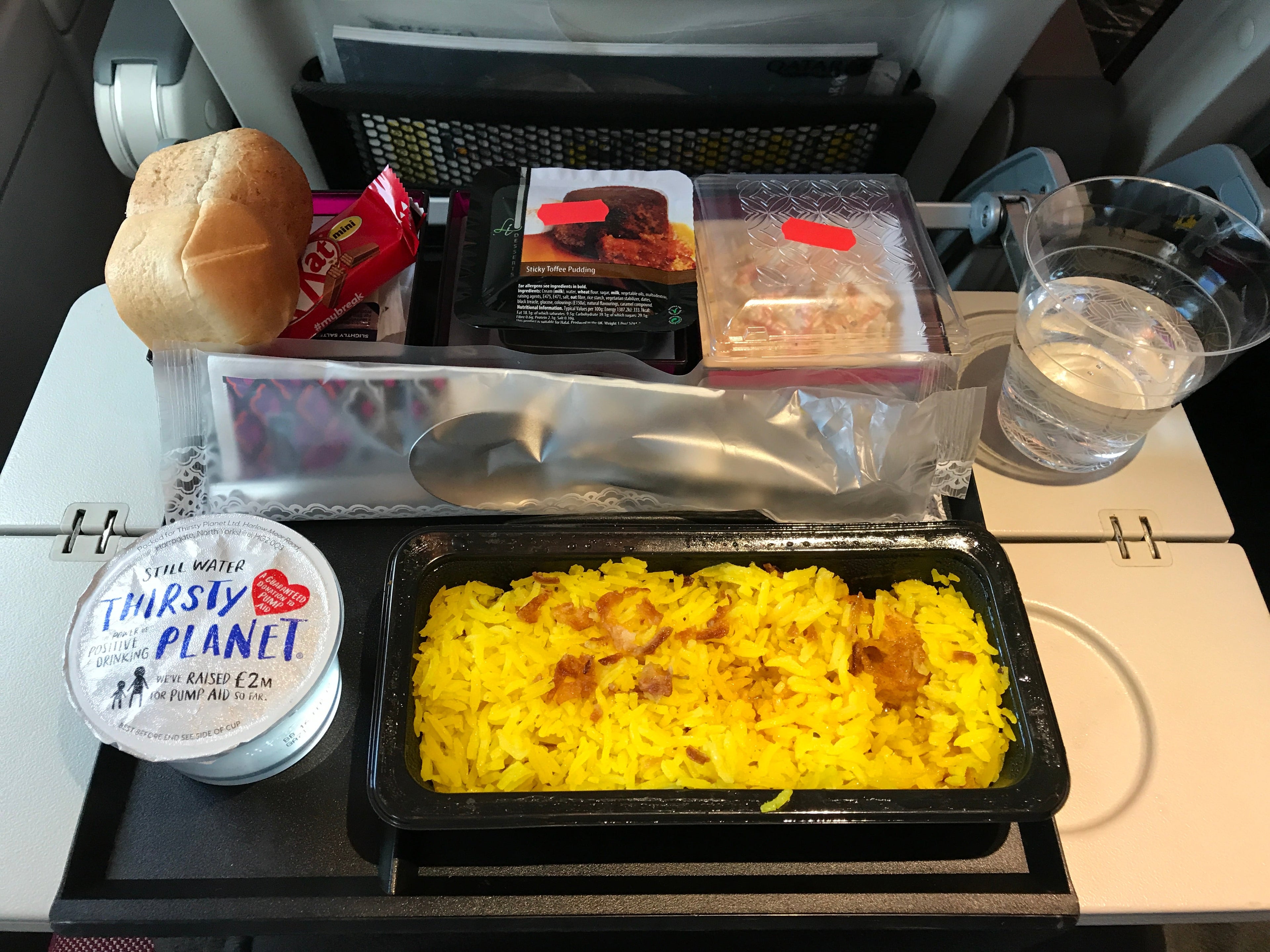 I opted for the chicken and rice. In terms of presentation, it was fine for an economy meal, although I initially couldn't see any chicken in the dish full of rice — it turns out there was a lot underneath it though. Much to my surprise, the meal was actually very tasty. A coleslaw salad was provided, along with a delicious, sticky toffee pudding for dessert.