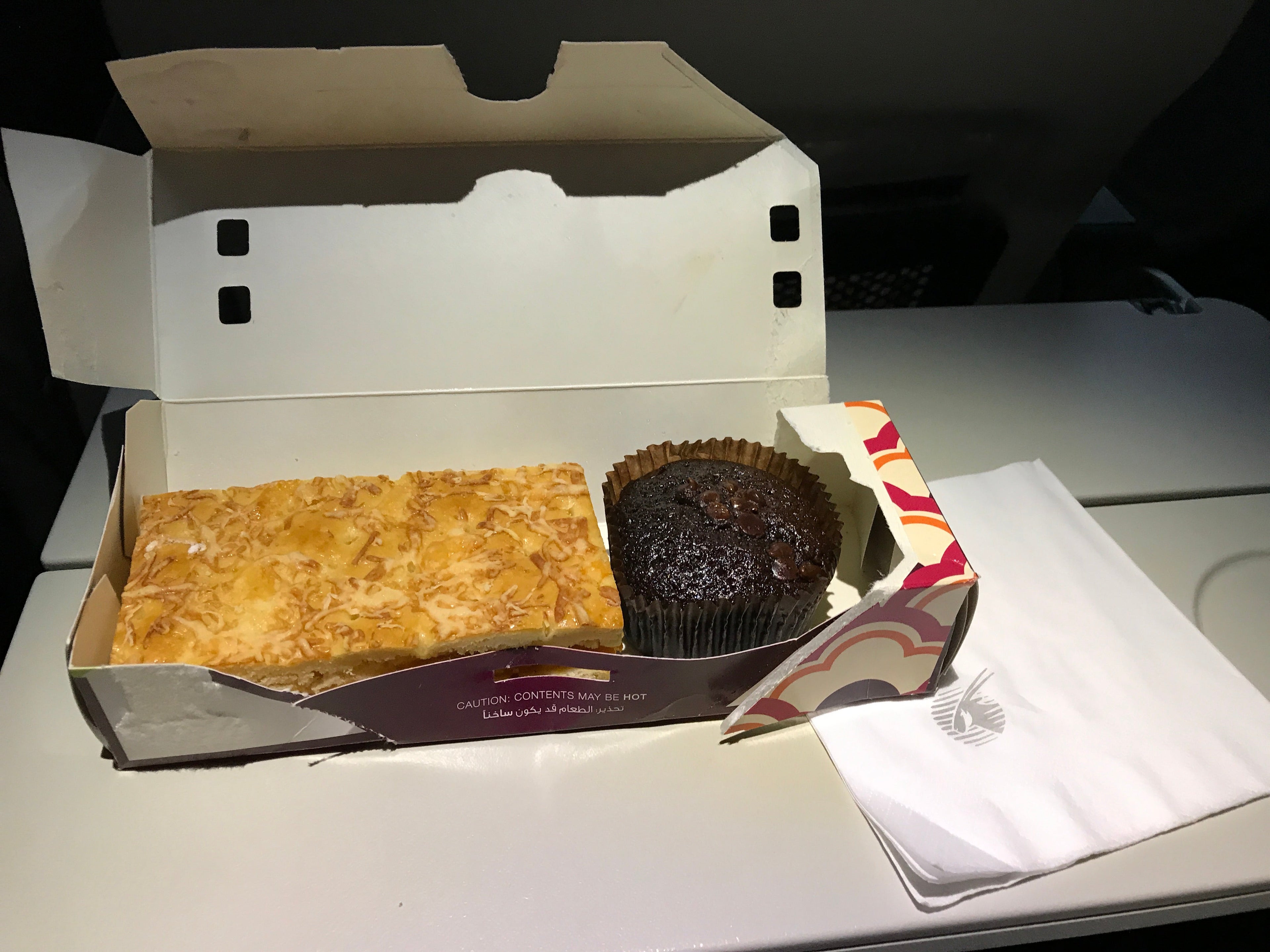 After I slept (across an empty row of seats) for about three hours, I was offered a snack before our arrival in Doha, a chicken pastry with a chocolate cupcake.