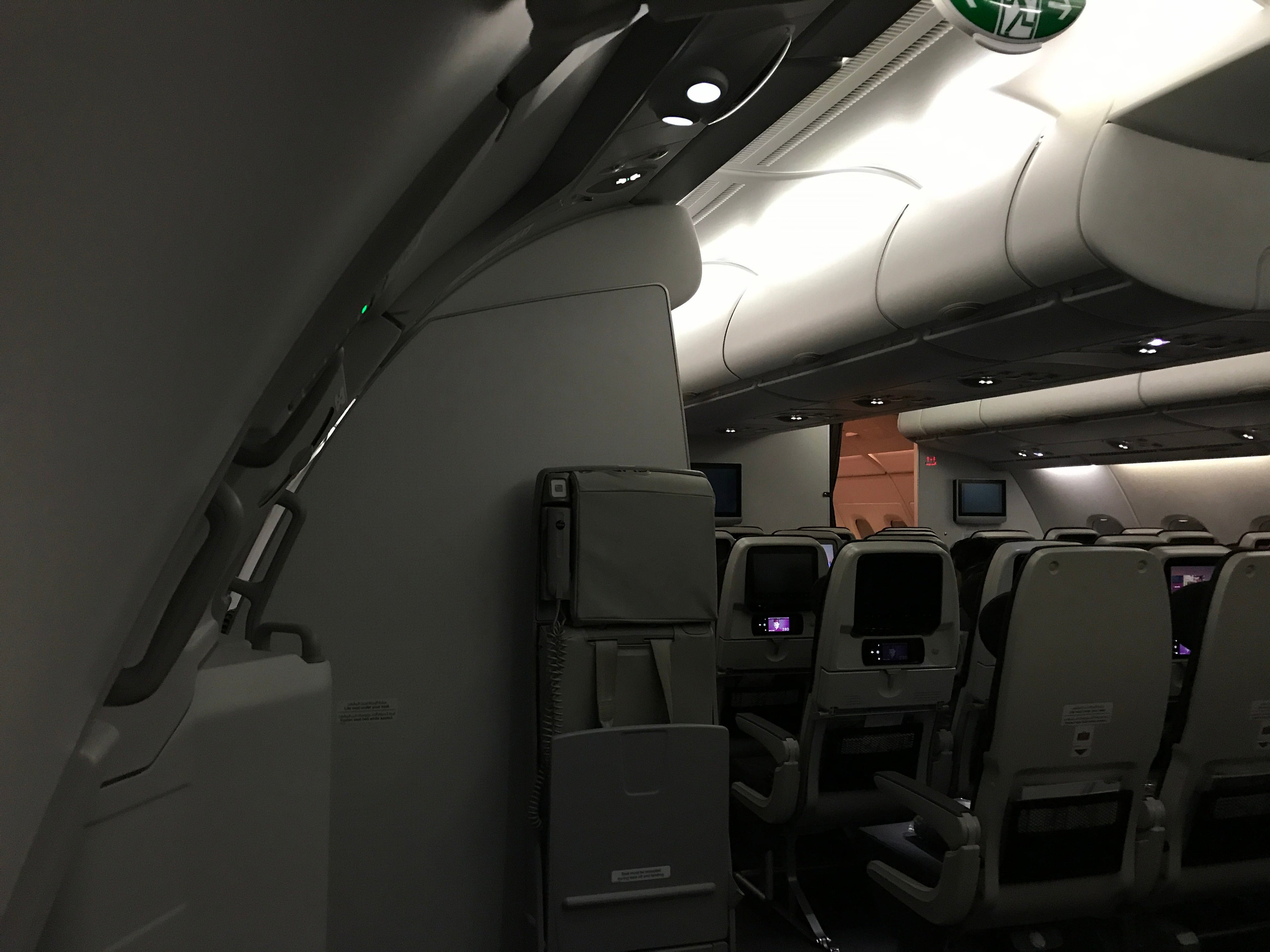 One thing I loved about the upper deck economy seats was the large side-wall storage area — essentially, it's dead space where a third seat couldn't be squeezed in, so instead, the seats have these handy storage compartments that perfectly held my laptop bag.