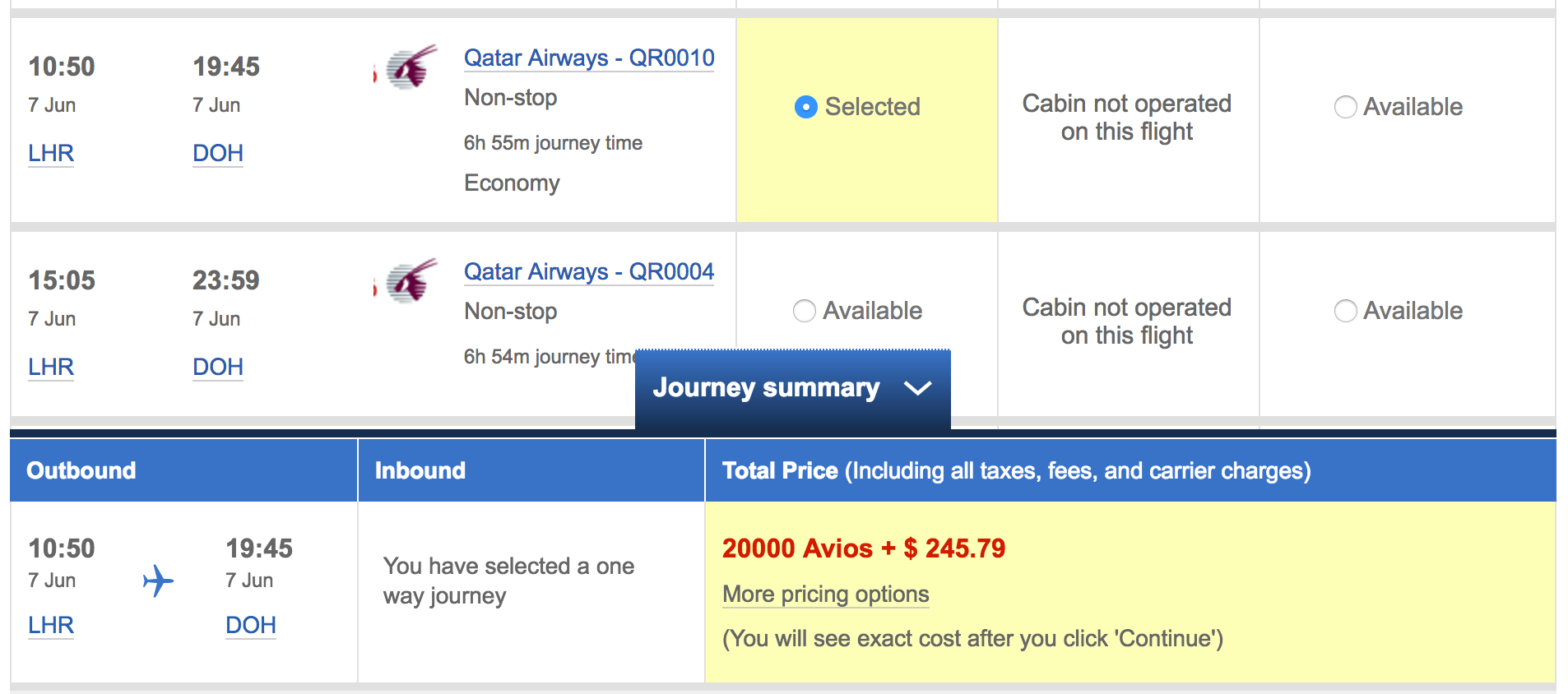 Qatar Airways is a member of the Oneworld alliance, meaning British Airways Avios can be redeemed for award seats. Considering the one-way flight would have cost $890 if paying cash, a redemption of 20,000 Avios (which we value at 1.5 cents each), plus a cash co-pay of $245.79 (to cover Britain's sky-high departure tax) was the obvious choice. We used The Platinum Card from American Express to pay for the cash portion, earning more than 1,200 Membership Rewards points in the process.