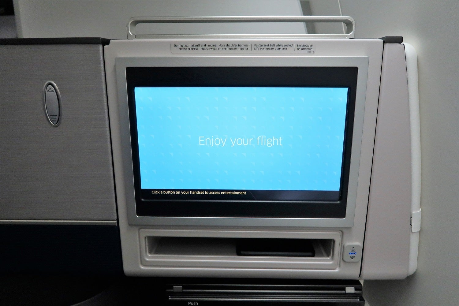 Under each IFE screen there's a very useful tray. However, there's not much of a lip to this very deep tray, so you're not going to want to store anything important (like your passport or phone) in here during takeoff, because it'll be difficult to fish it back out later. I almost learned this the hard way.