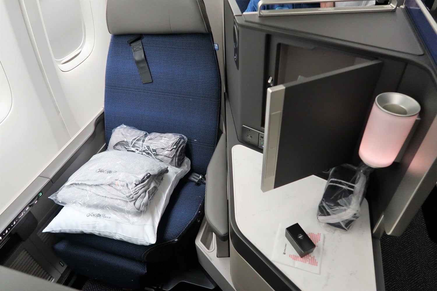 At boarding, each Polaris seat was stocked with a large pillow, as well as a plastic-wrapped blanket and duvet. A small box containing a Polaris chocolate and the amenity kit were left on the side table.