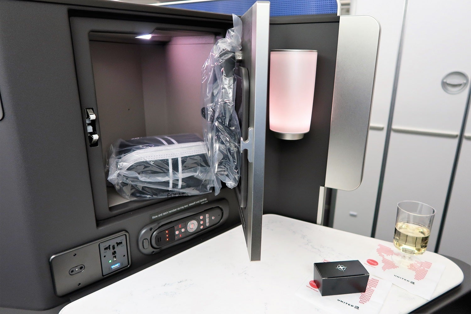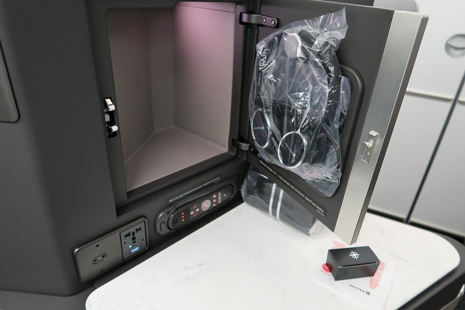 At boarding, a pair of over-the-ear headphones came wrapped in plastic and hanging on a hook in the seat's cabinet. The two-prong headphones provided decent-quality sound but didn't seem to provide any active noise cancellation. There's a USB plug under the IFE screen, and under the small cabinet you'll find a universal power adapter adapter (and another USB port!), IFE remote as well as the jack for the headphones.