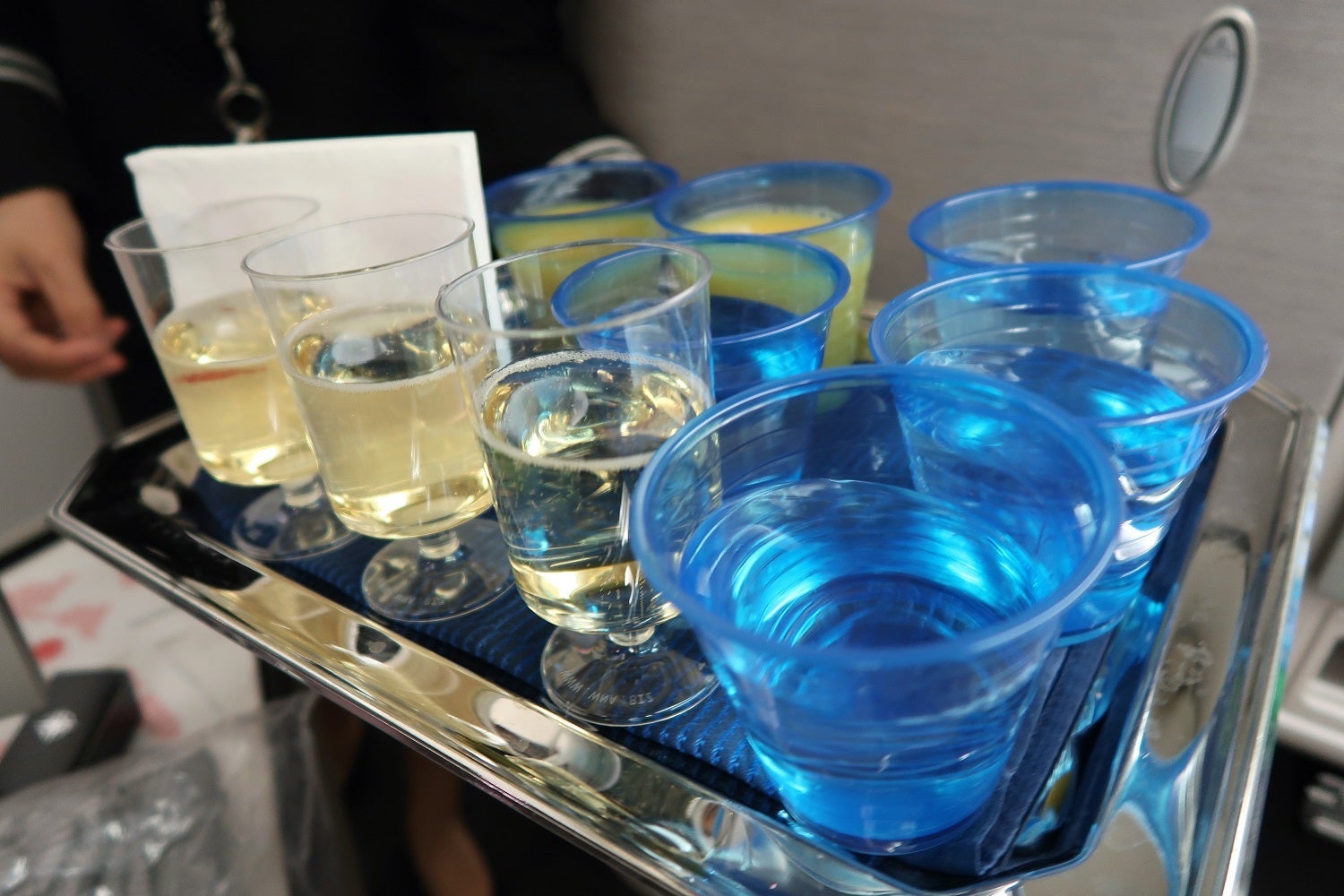 During boarding, flight attendants passed through the cabin multiple times to offer welcome drinks. The choices were Champagne, water and orange juice. I didn't inquire if other drinks were available.
