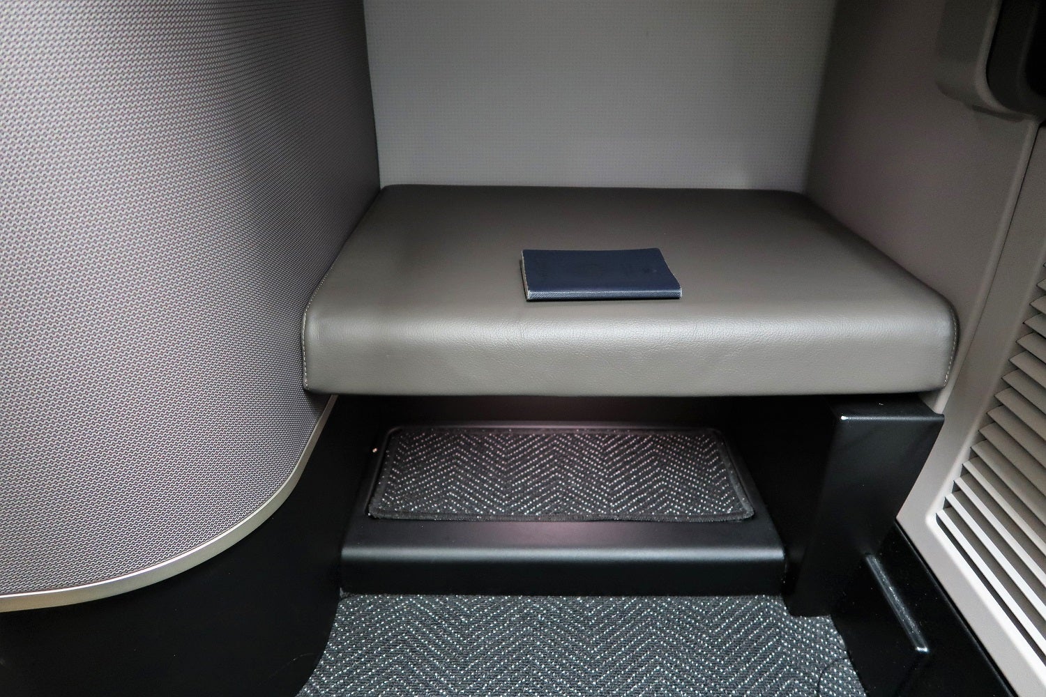 From what I could tell, these are the exact same seats you'll find on the carrier's 777-300ER. Each one has a small cabinet rated to hold small items during taxi, takeoff and landing. Under the cabinet is a sleek table and mounted next to that is a classy looking light.
