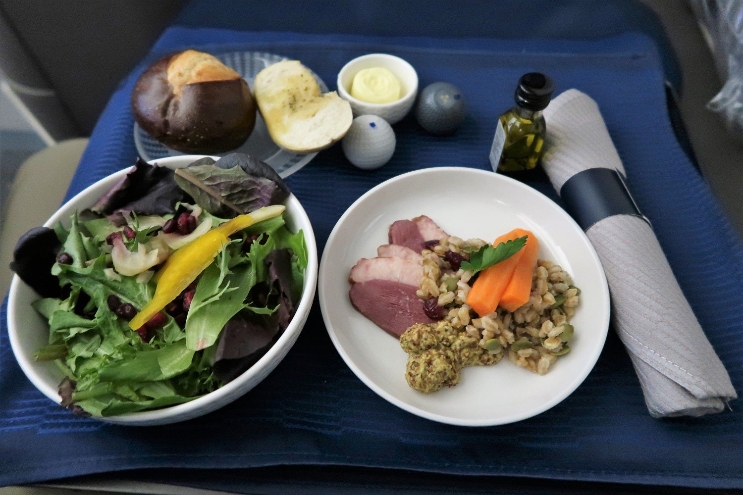 Although the drink menu I received said that FAs will offer the airline's specialty beverage service, no one offered me this. However, I knew that the wine tasting was an option, so I asked for a white wine flight. I ended up with three different whites to sip along with my main course. Note, though, that the wine tasting option will soon be eliminated, as United's going through a lot more wine than it had anticipated.