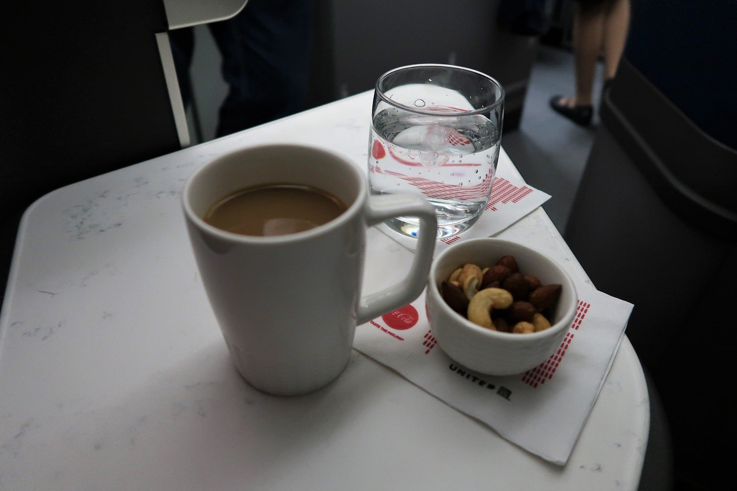 While one FA was taking meal orders, another worked the cabin taking and serving drink orders. When I asked for a cup of coffee, she suggested a glass of still or sparkling water as well. The drinks were served with a bowl of warmed nuts.