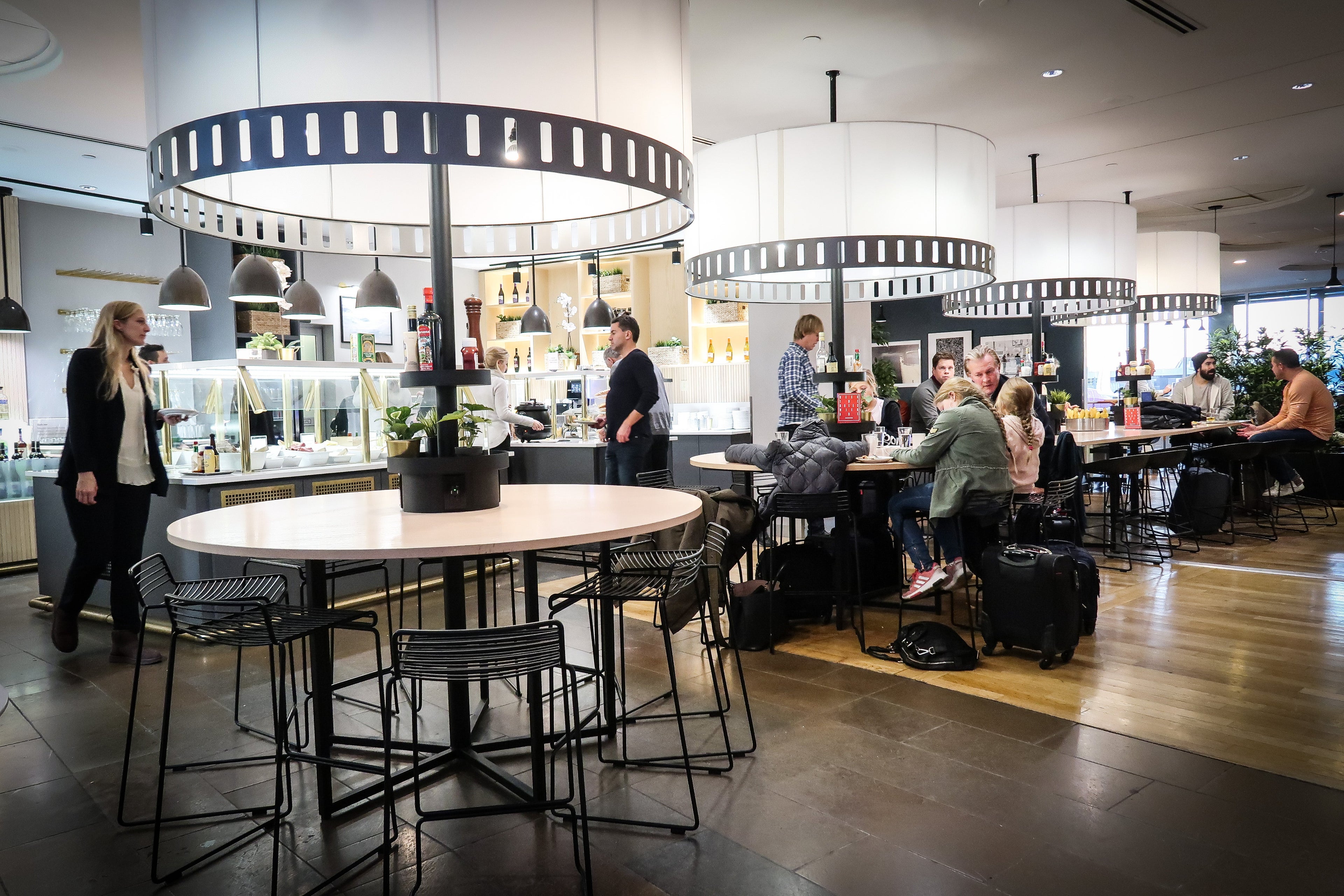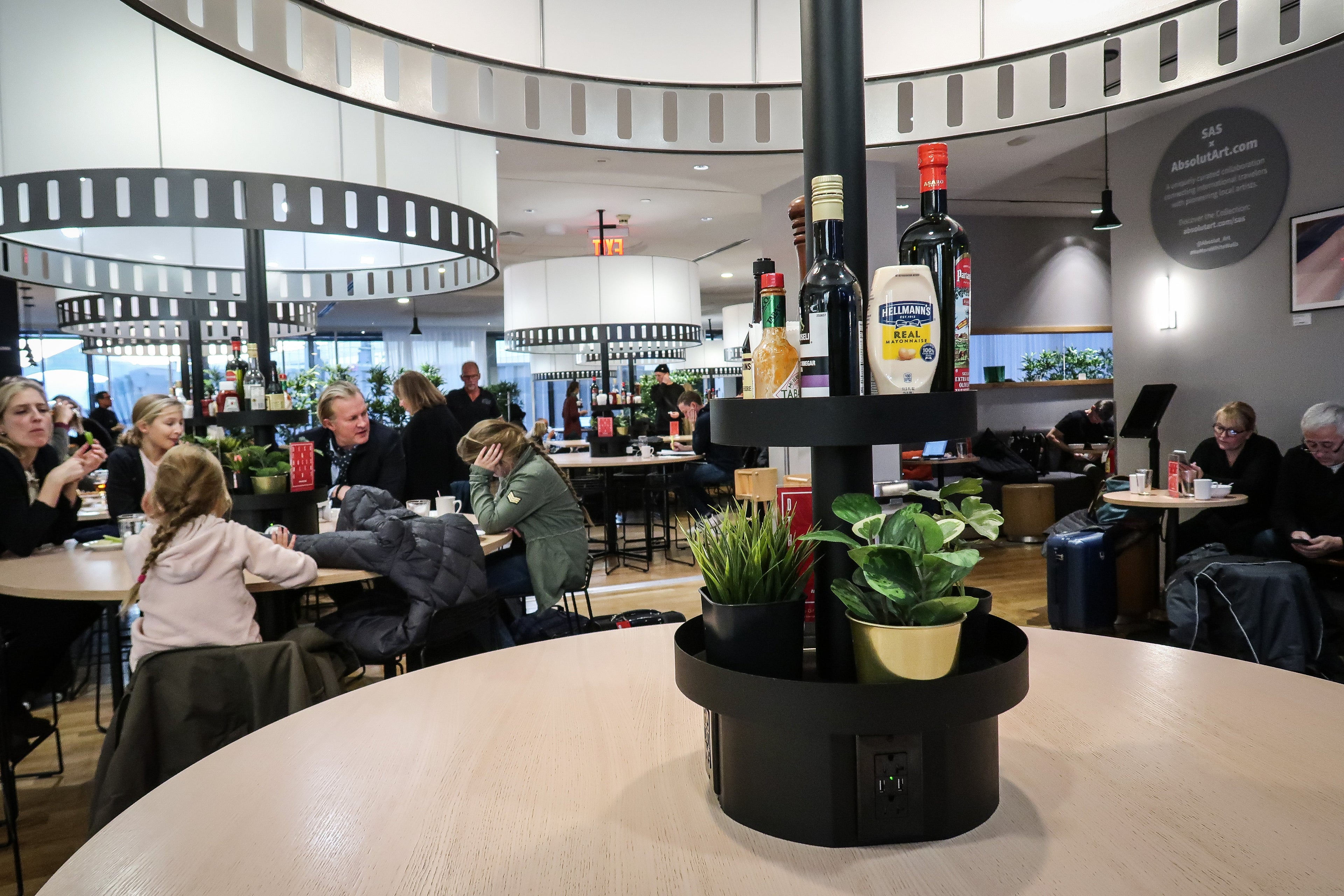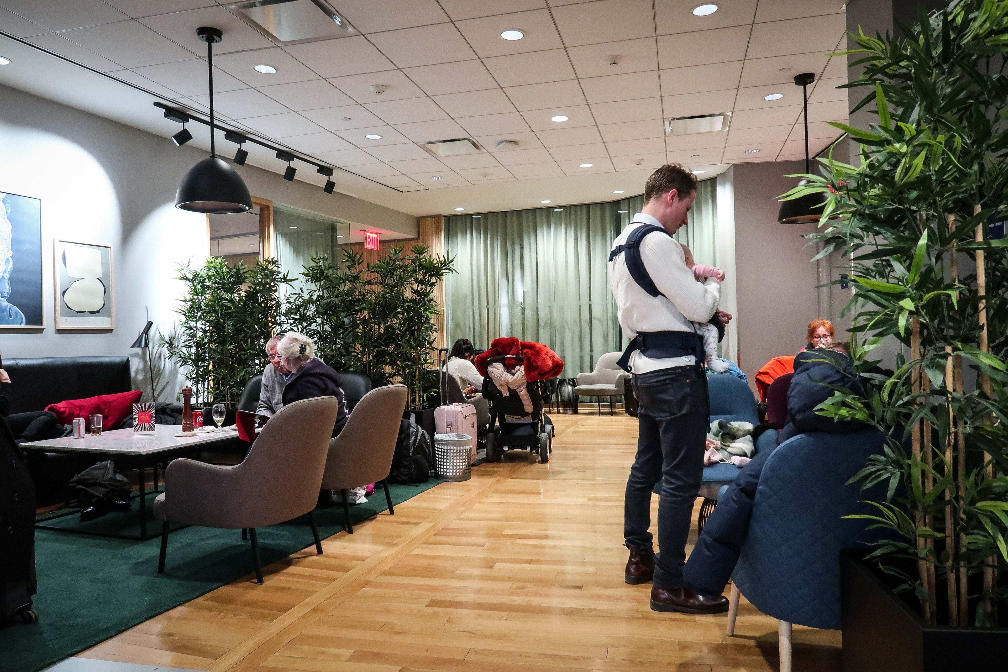 I headed to the Terminal B SAS Lounge, which felt appropriately Scandinavian to me, with its light wood accents, round tables and muted colors. The lounge had various nooks and crannies, and was very busy during my visit. Despite it being filled with travelers, there were seats available, and the food was replenished regularly.