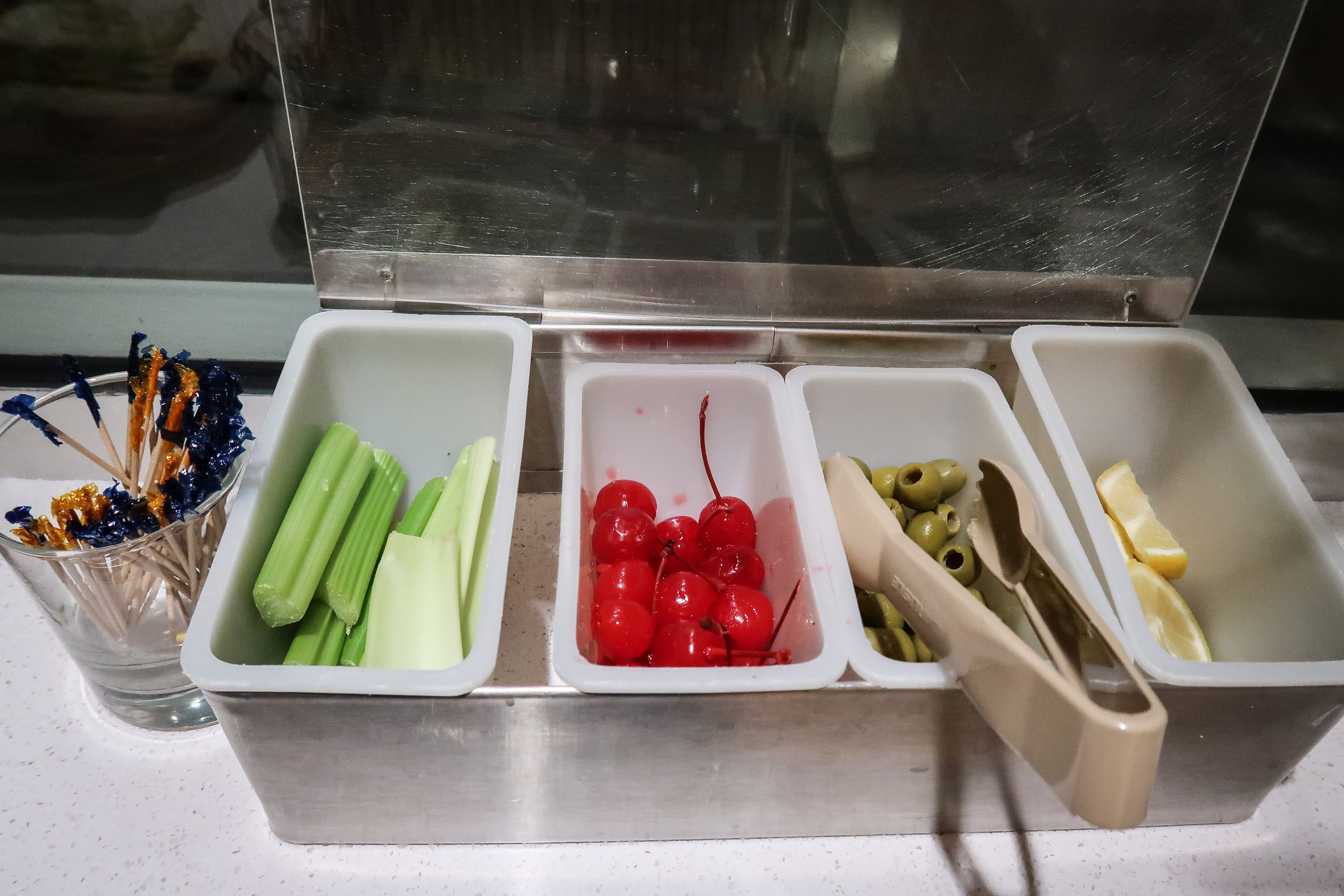 I was delighted to find an all-you-can-eat tray of maraschino cherries. A welcome but dangerous feature of this lounge.