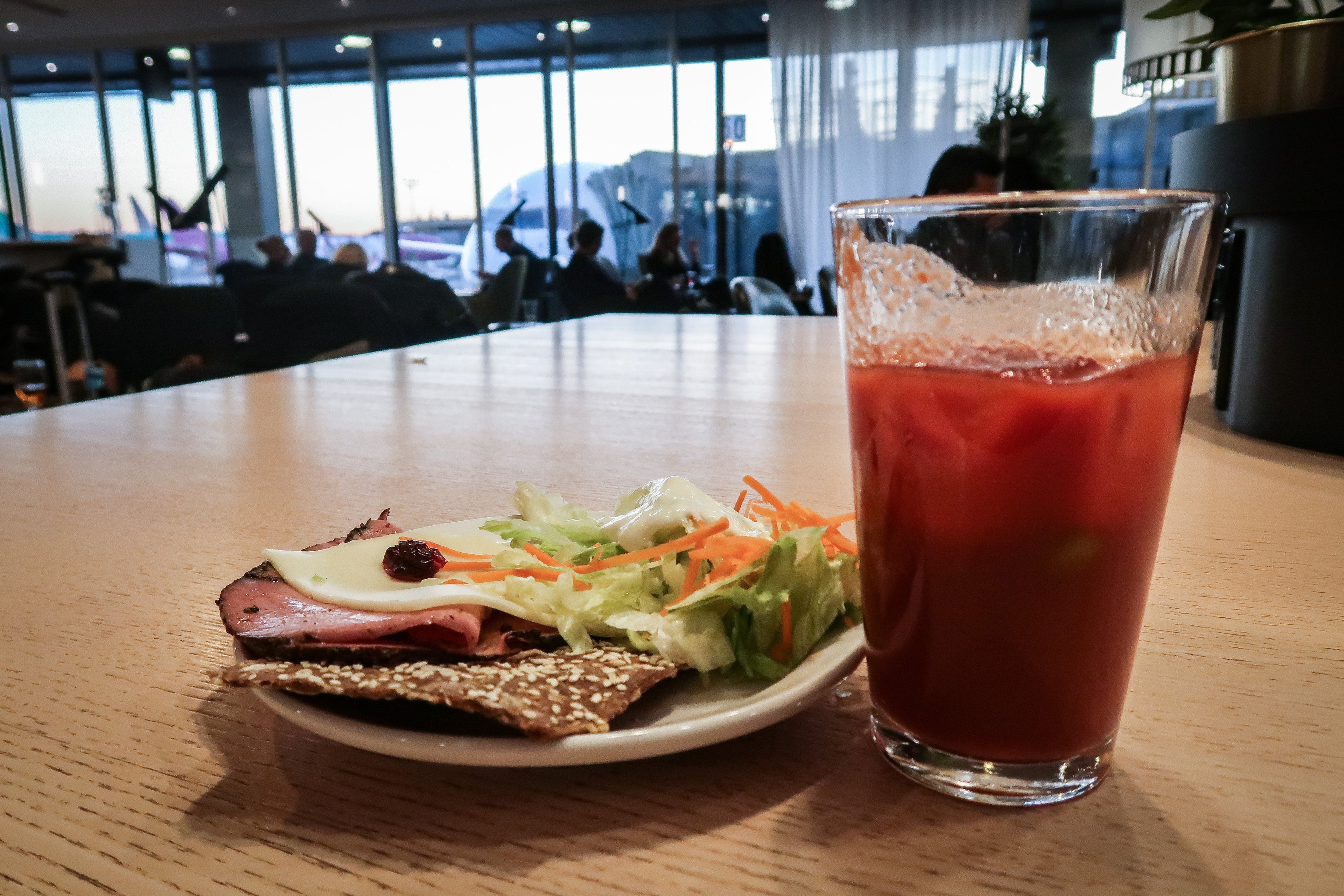 After walking around the lounge for a little bit, I took a plate of cold meats, cheese and salad and a tomato juice, and settled down for my short stay.