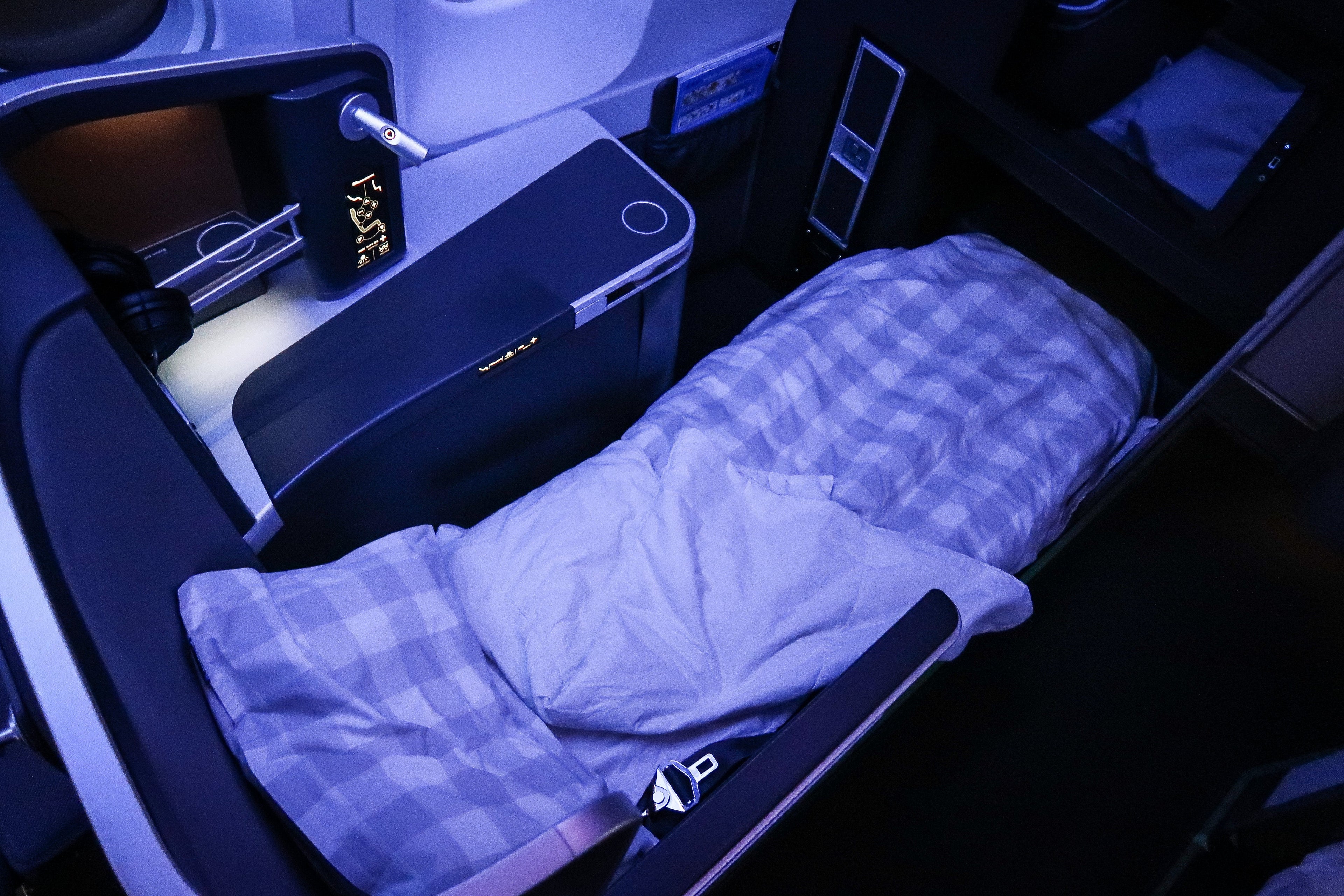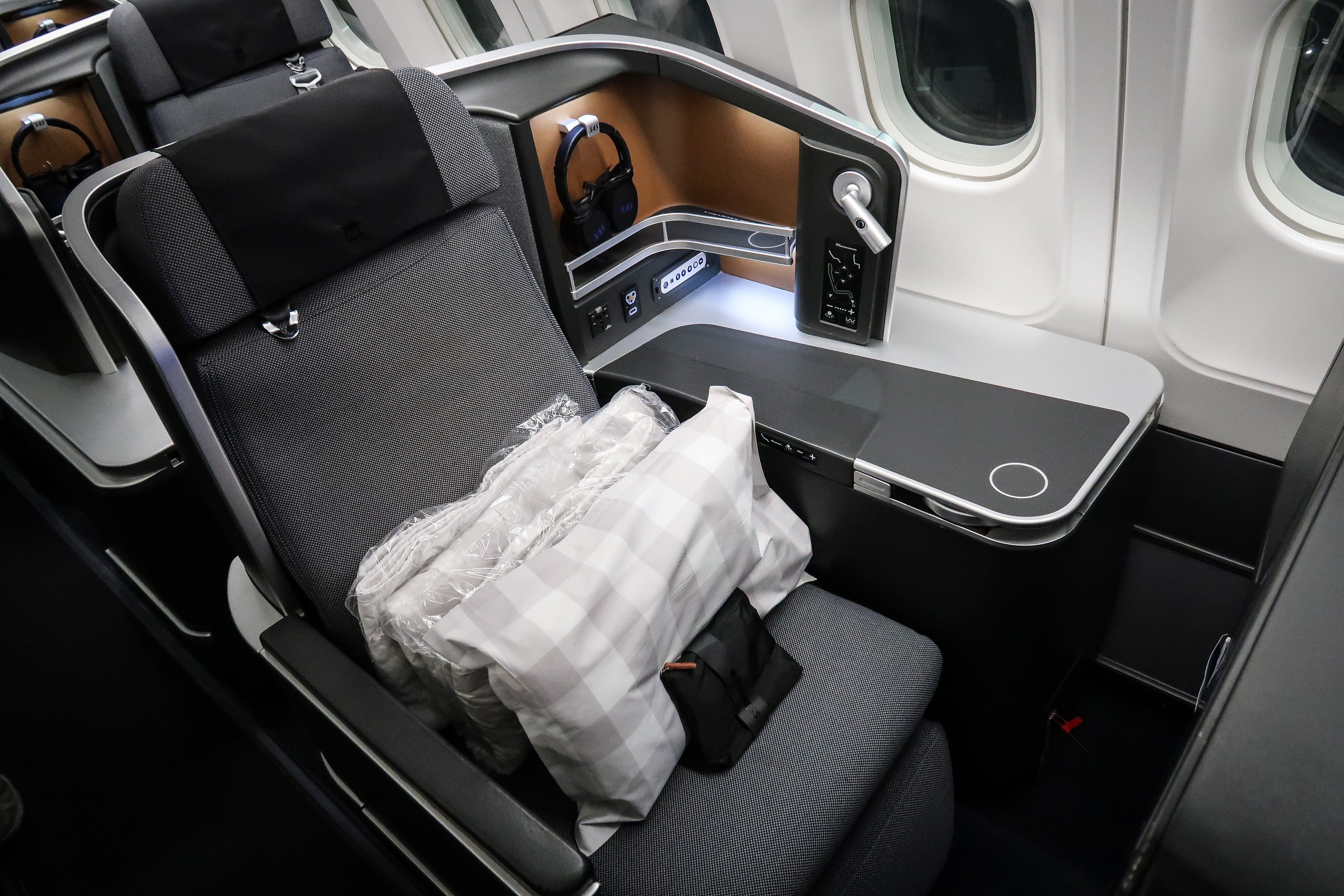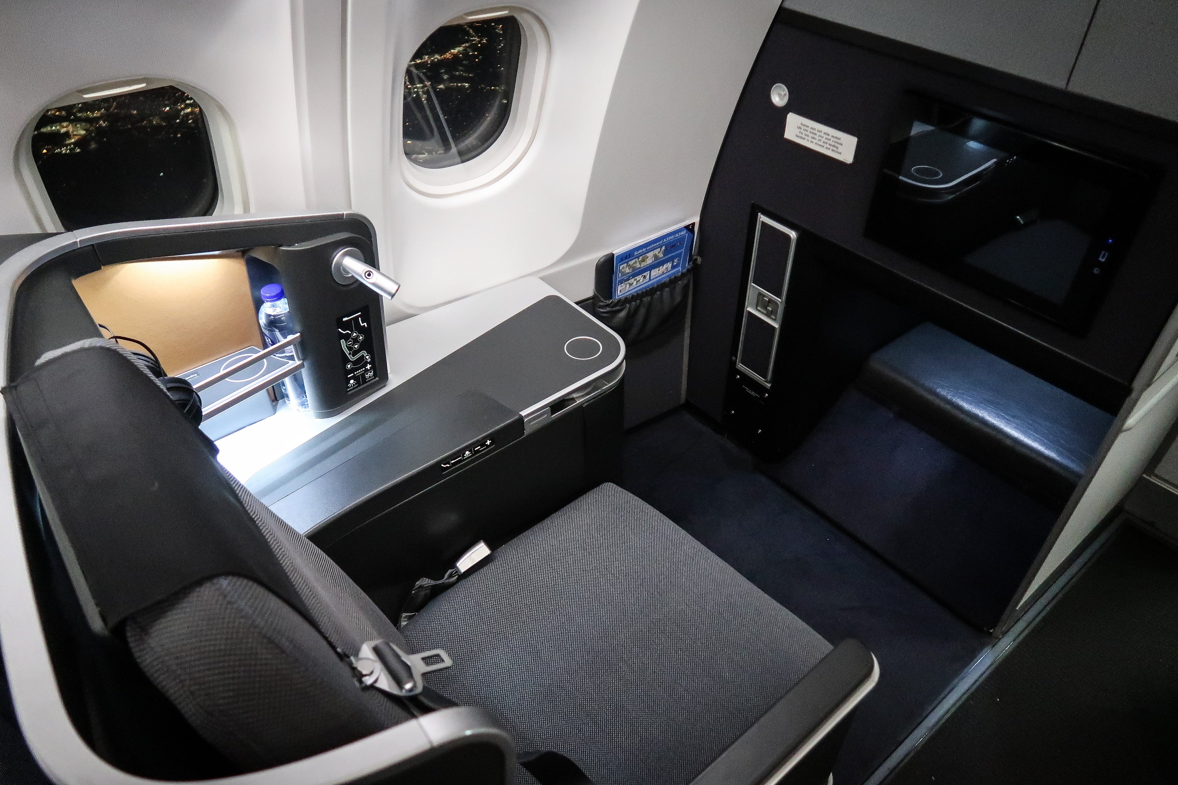 I was seated in 2A, a single-window seat which was "protected" from the aisle. If you're traveling alone, this is one of the best seats you can grab. The seat was set up with a pillow, thin mattress and duvet when I arrived, along with the amenity kit.