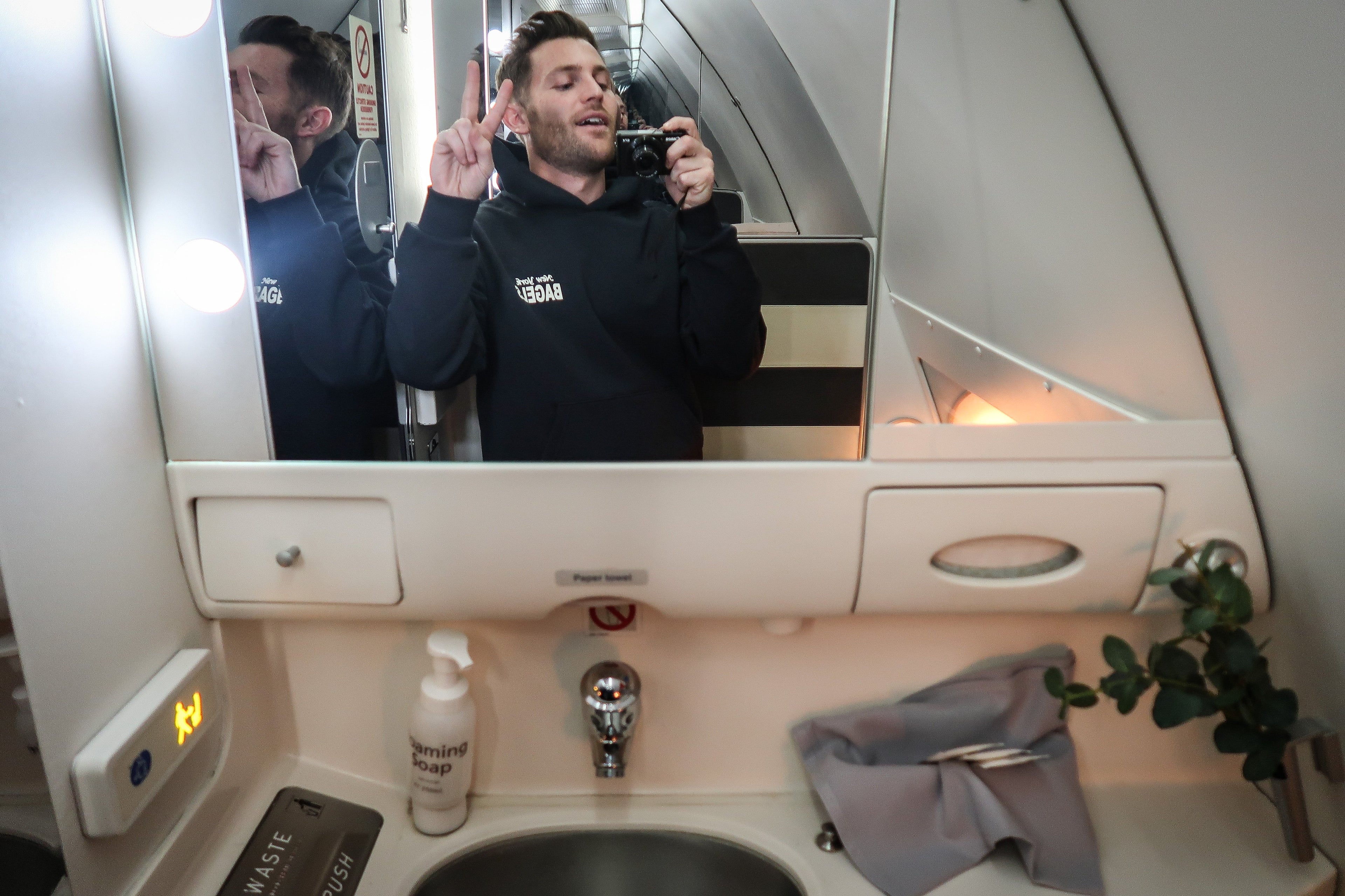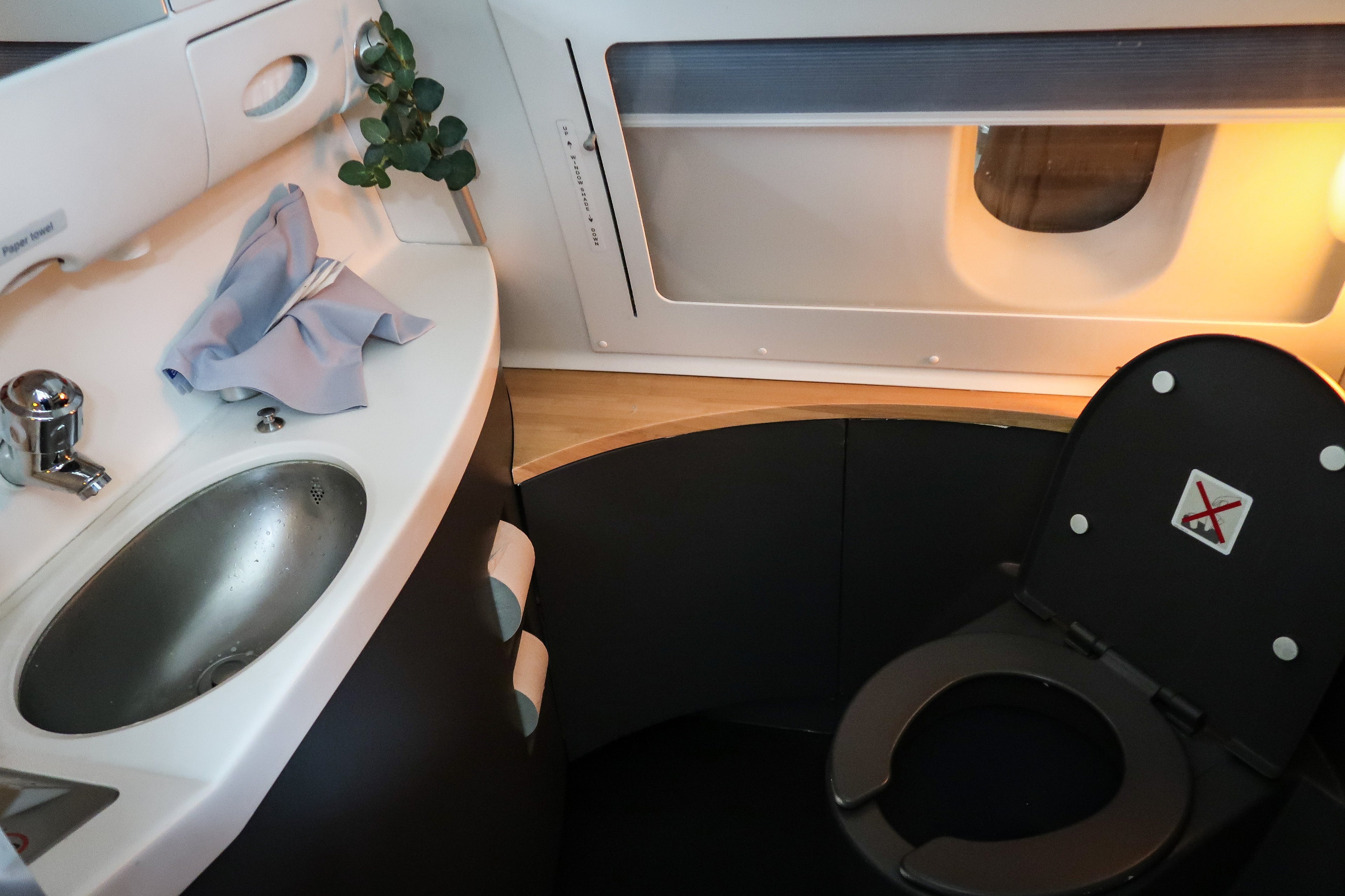 The business-class lavatories were larger than average, and had fresh greenery to liven things up.