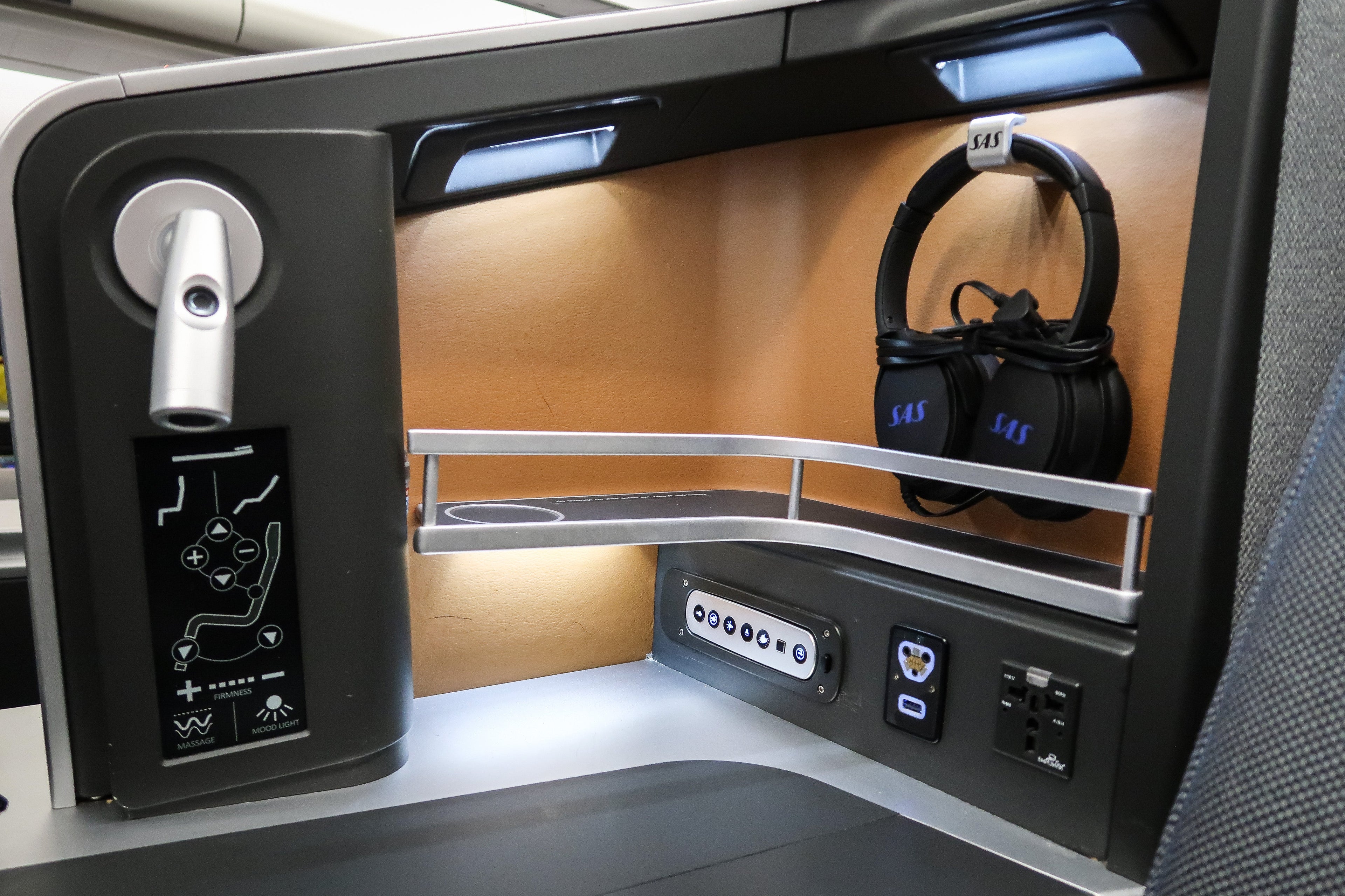 There was a handy shelf by the seat, with plenty of flat space to put personal things, a USB outlet and universal power outlet.
