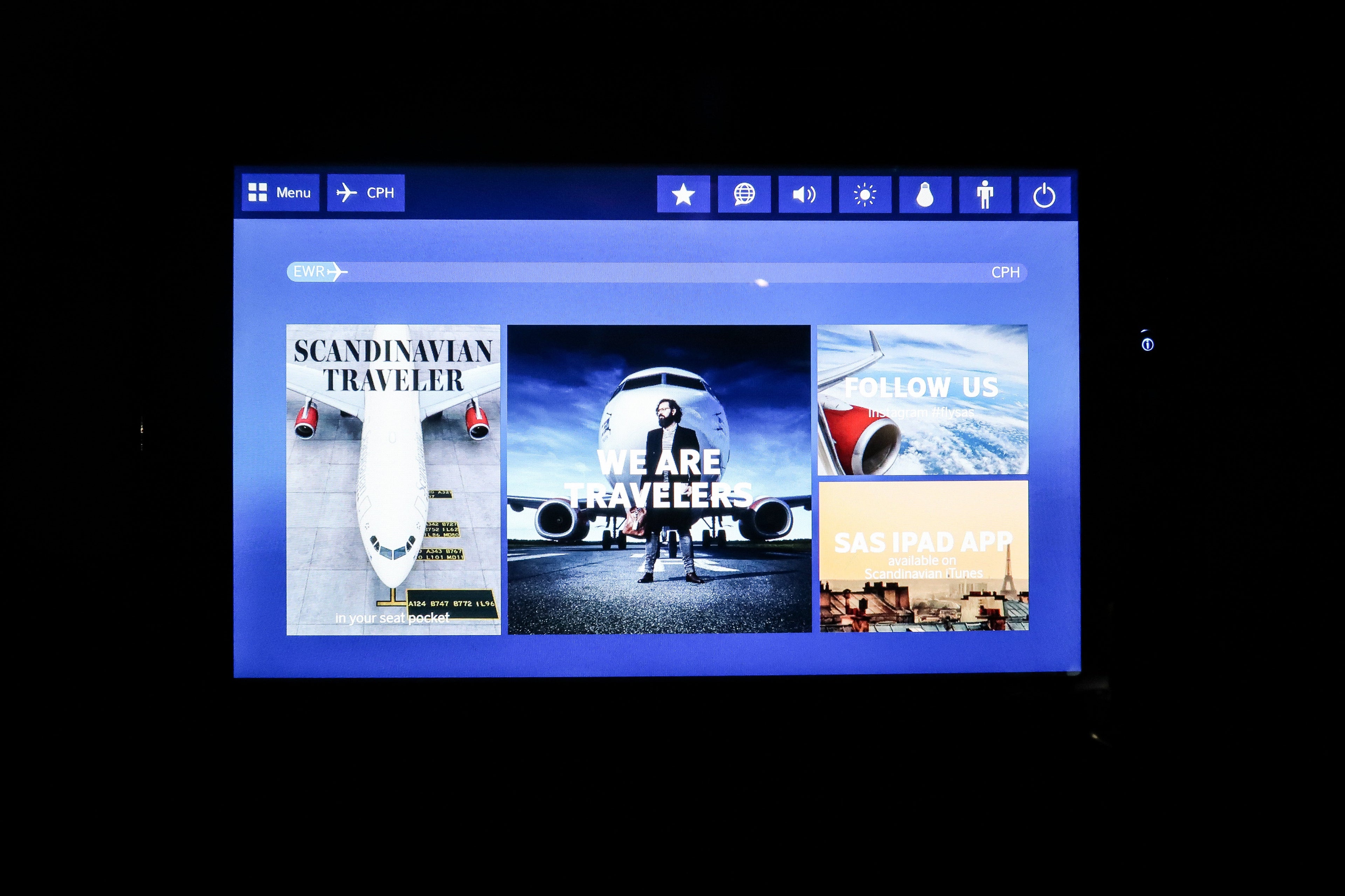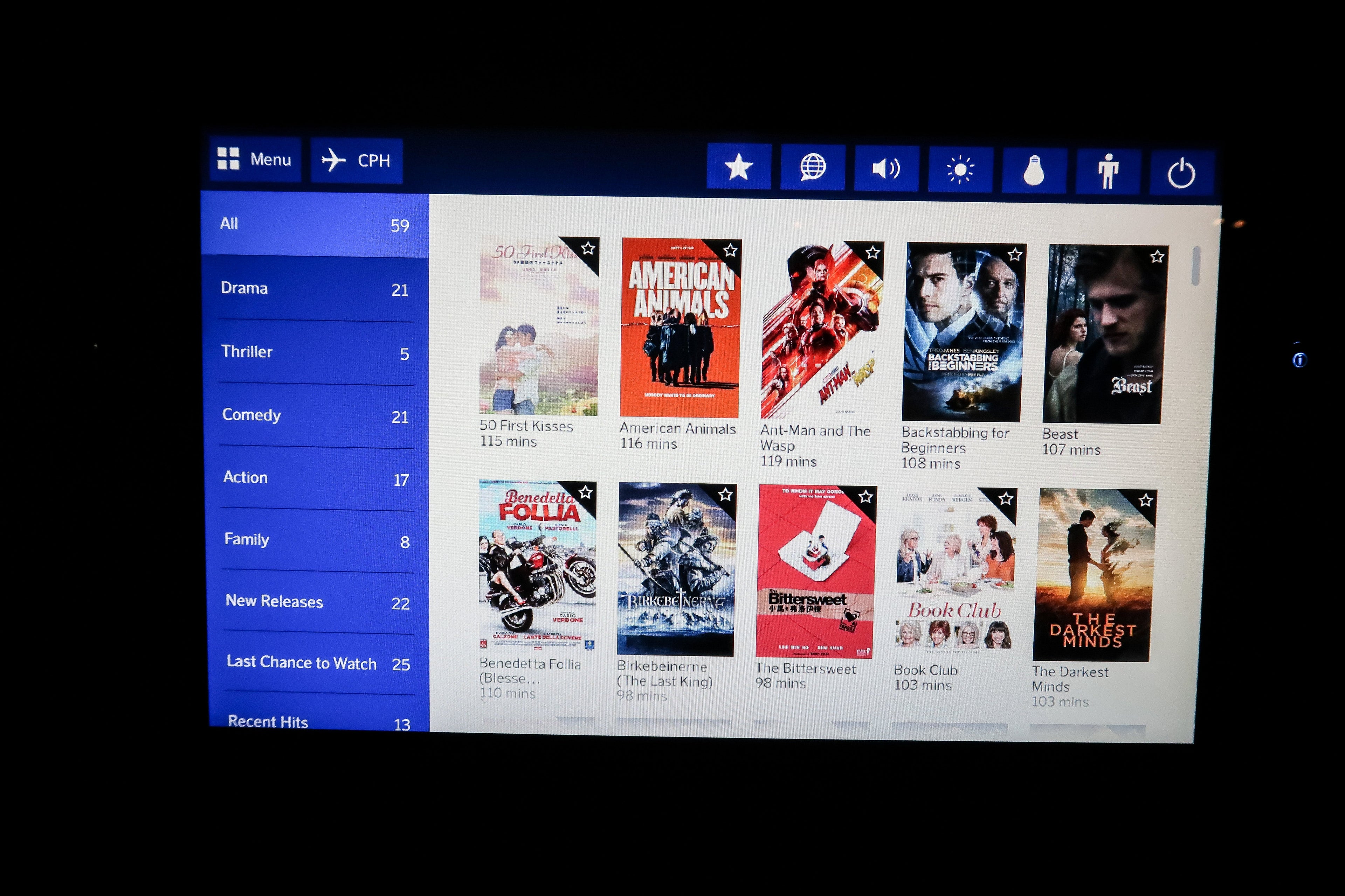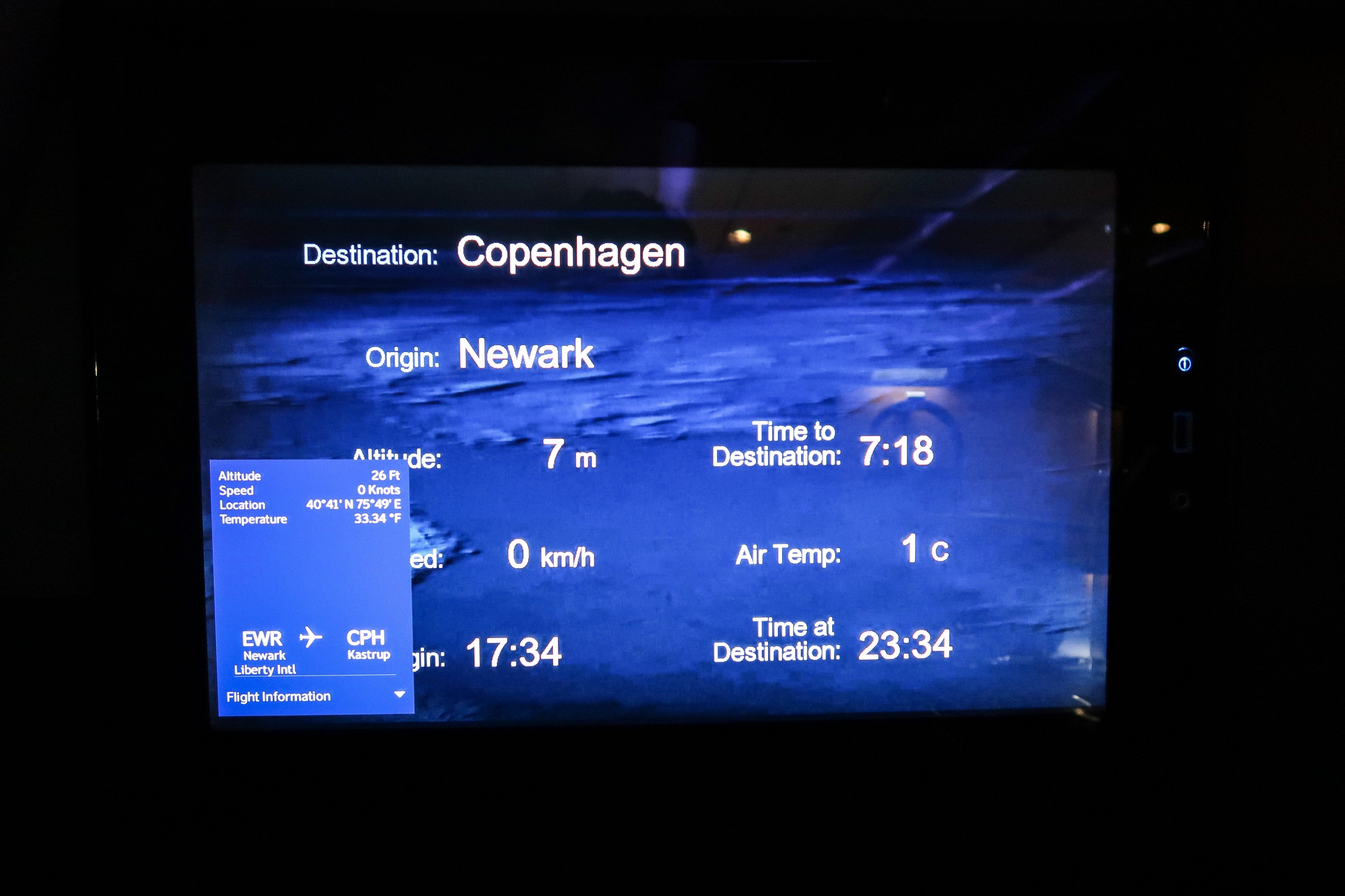 The IFE system itself was easy to use and had a decent selection of 59 films. There was a tailcam, but there wasn't much to see on this night flight but for some blurry lights as we approached Copenhagen (CPH).