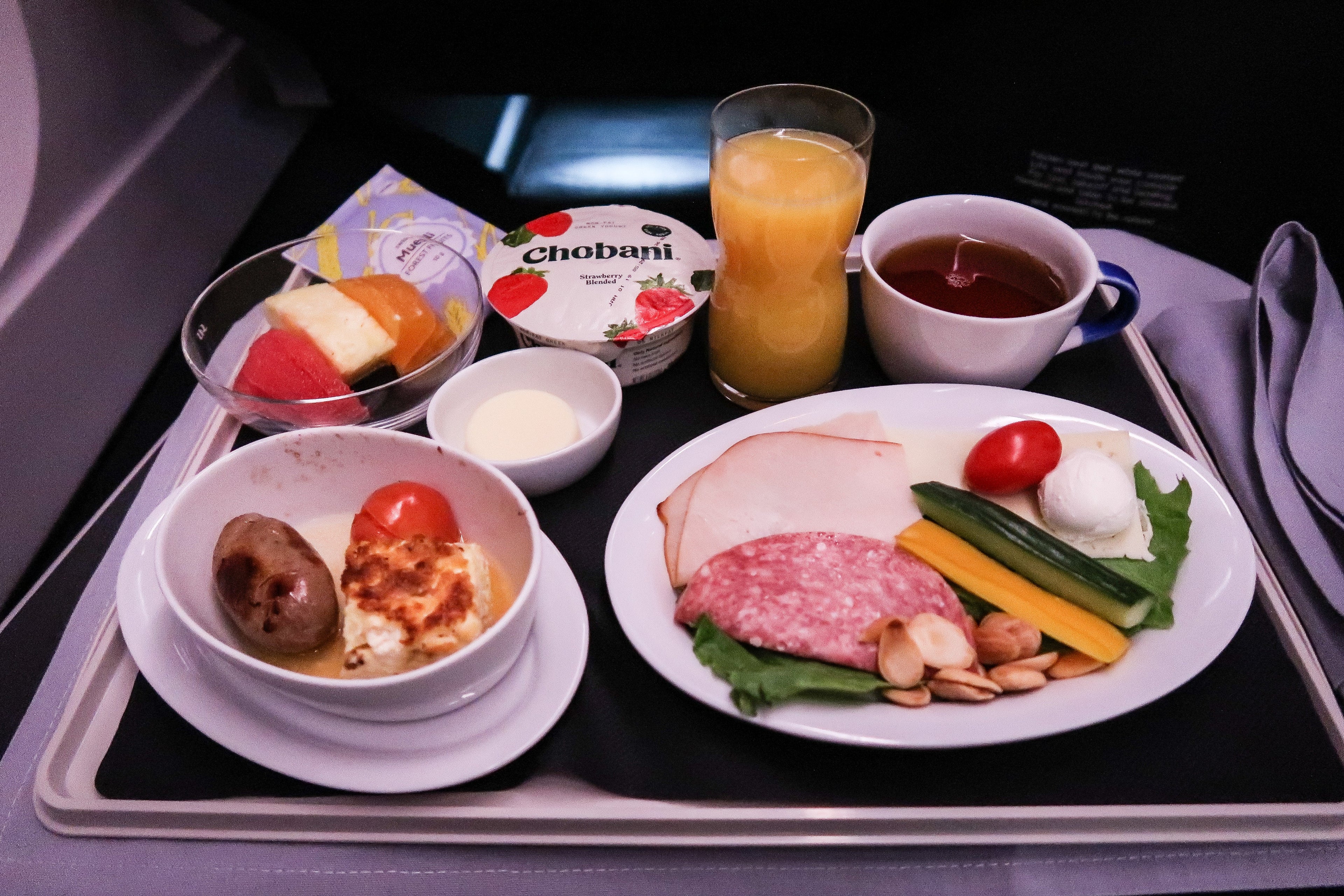 Breakfast was served an hour before landing, and consisted of a cold selection of breakfast bits with a hot sausage and goat-cheese frittata -- all of it was lovely.