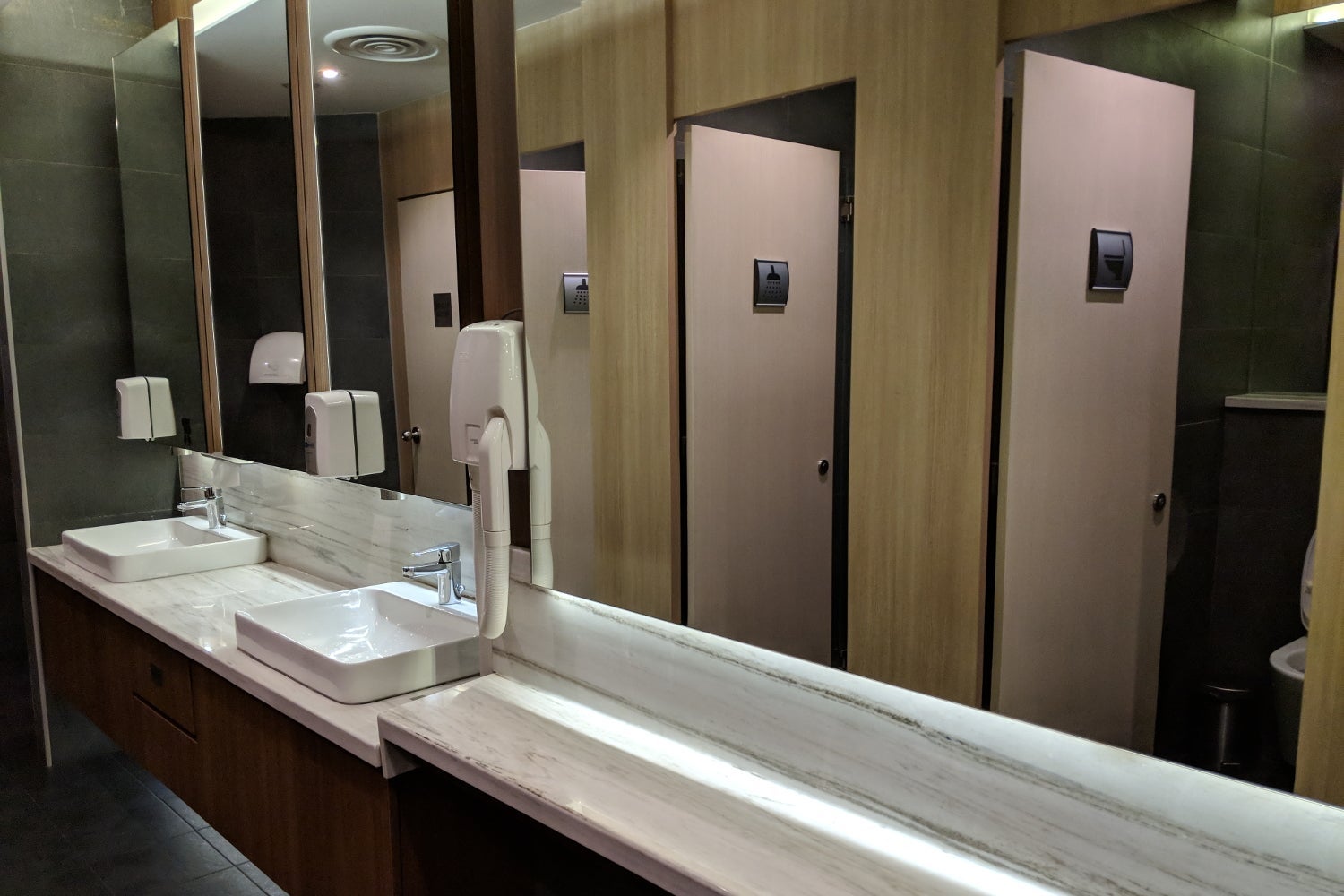 In the women's restroom were two showers, two toilets and a makeup counter with hair dryers. The showers were practical and looked relatively clean, but this wasn't a lounge where the showers were cleaned or reset between uses.