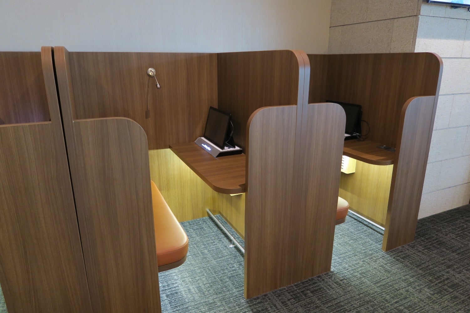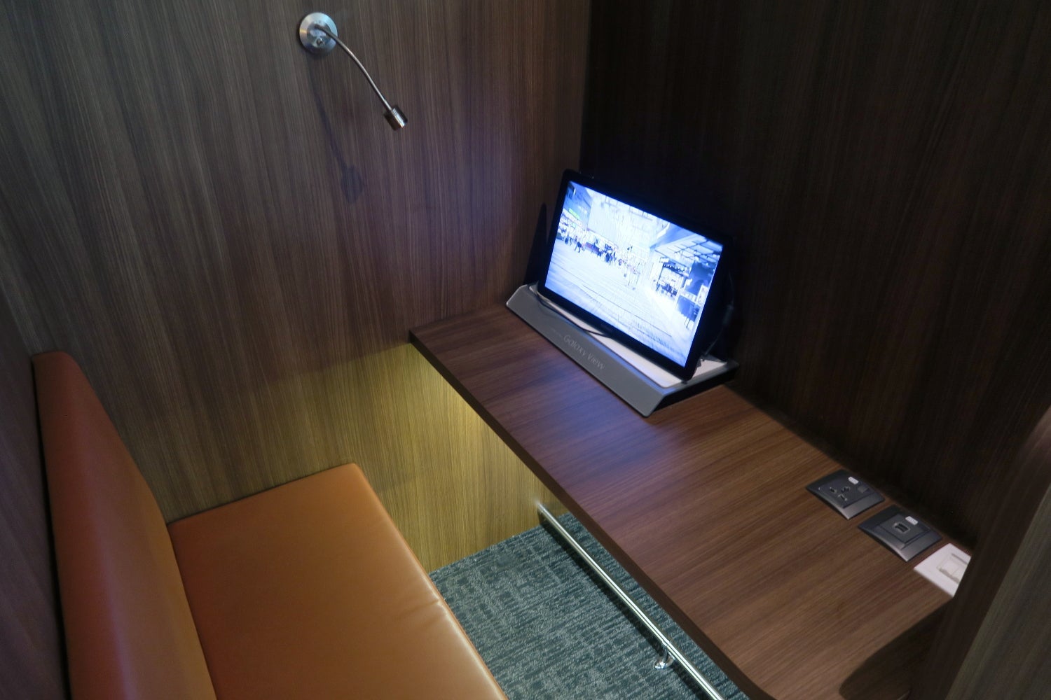 There were eight bench-seat cubicles along one side of the lounge. Each cubicle had a large tablet connected to the internet and could be used for surfing the web. These cubicles were ideal for working, and were the only table spaces with power outlets — as long as you could figure out how to turn off the tablet screen. I had mixed luck in doing so when I tried a few different cubicles.