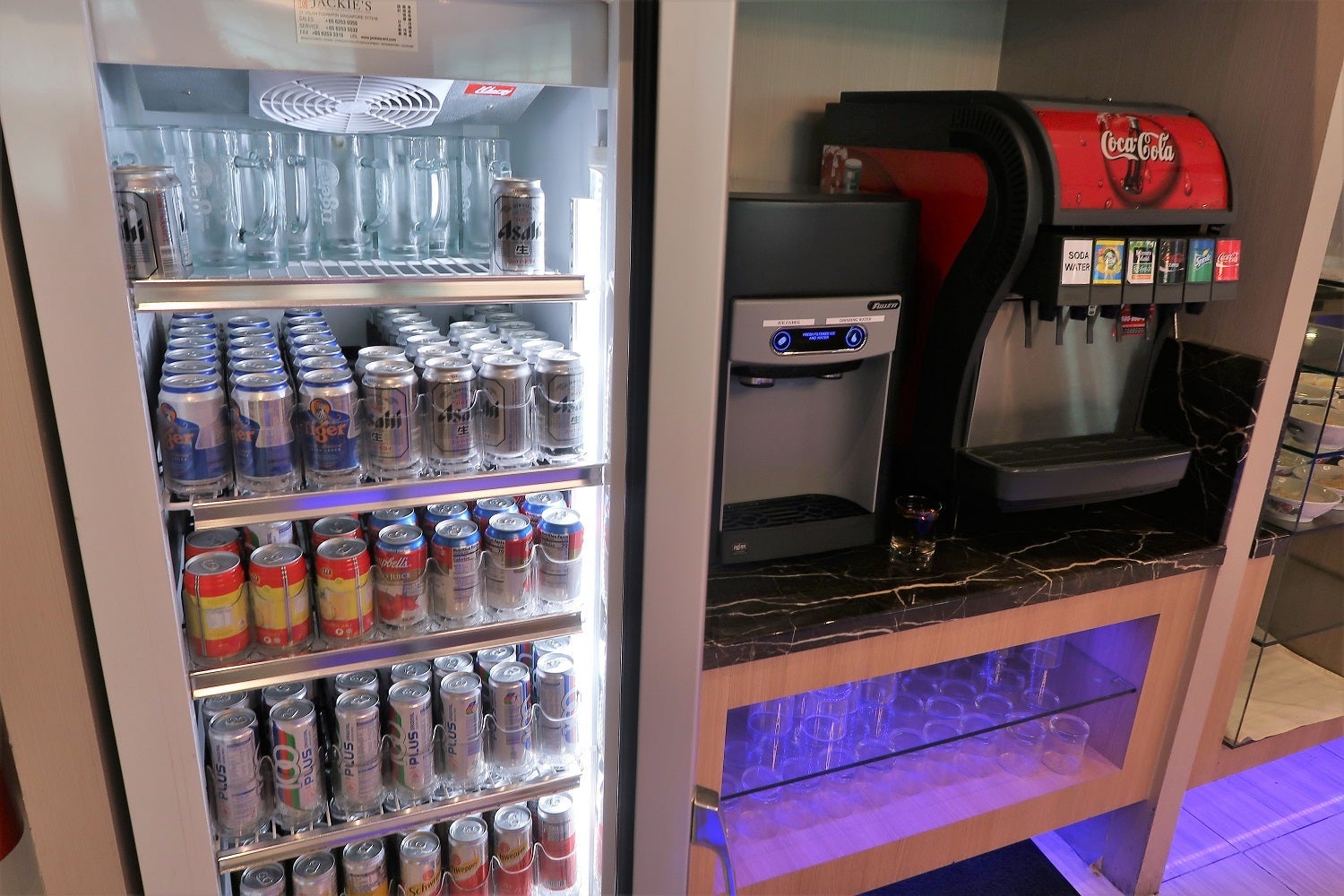 There was a refrigerator with two types of beer, Tiger and Asahi, cold beer glasses and various canned drinks including sodas and fruit juices. Next to the refrigerator was a soda machine with six different types of soda.