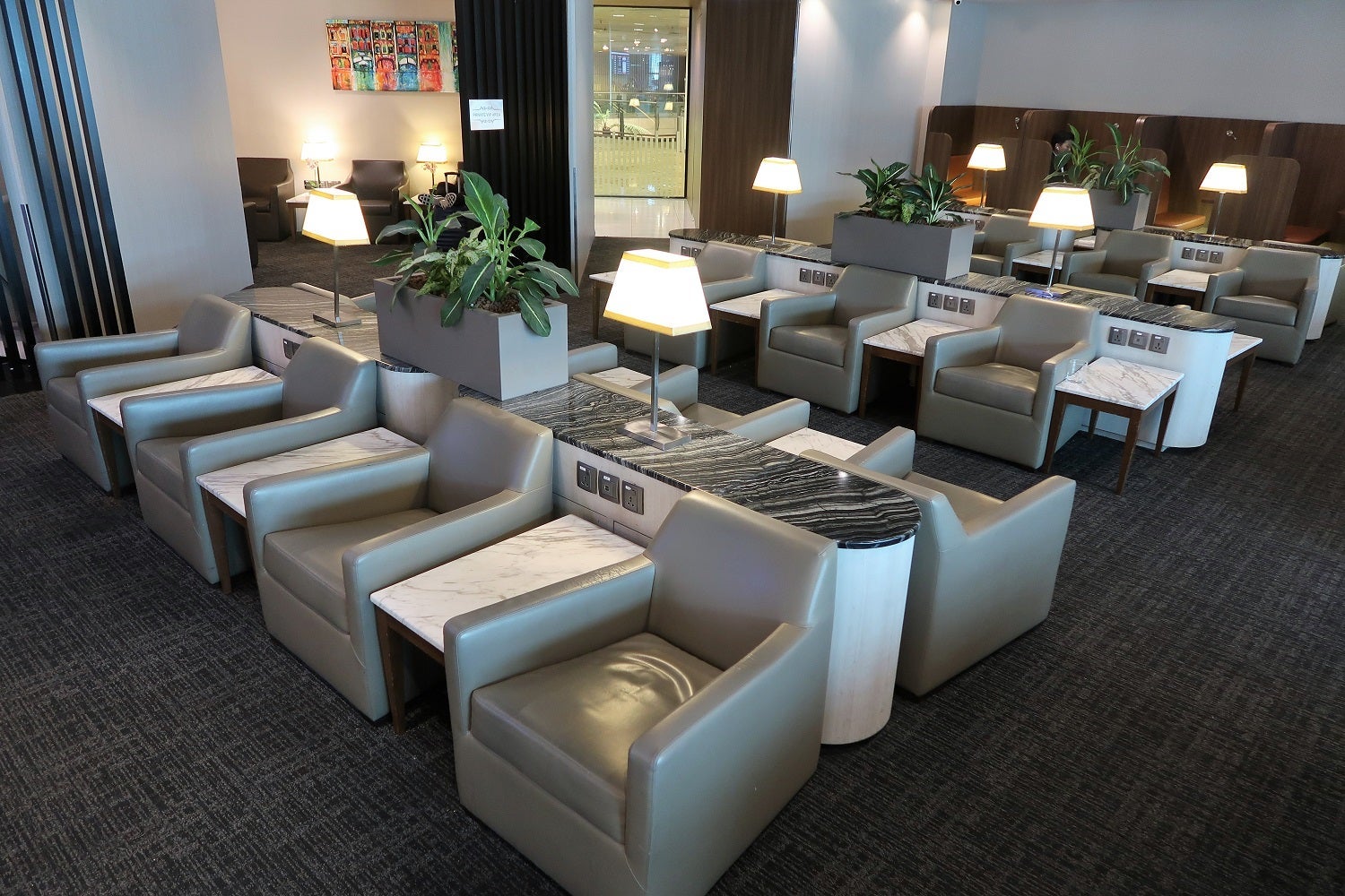Seats were separated by faux-marble tables. Above each table were two universal power outlets and two USB outlets. So, although there were a lot of seats in the lounge, it didn't feel too crowded and there was ample power.