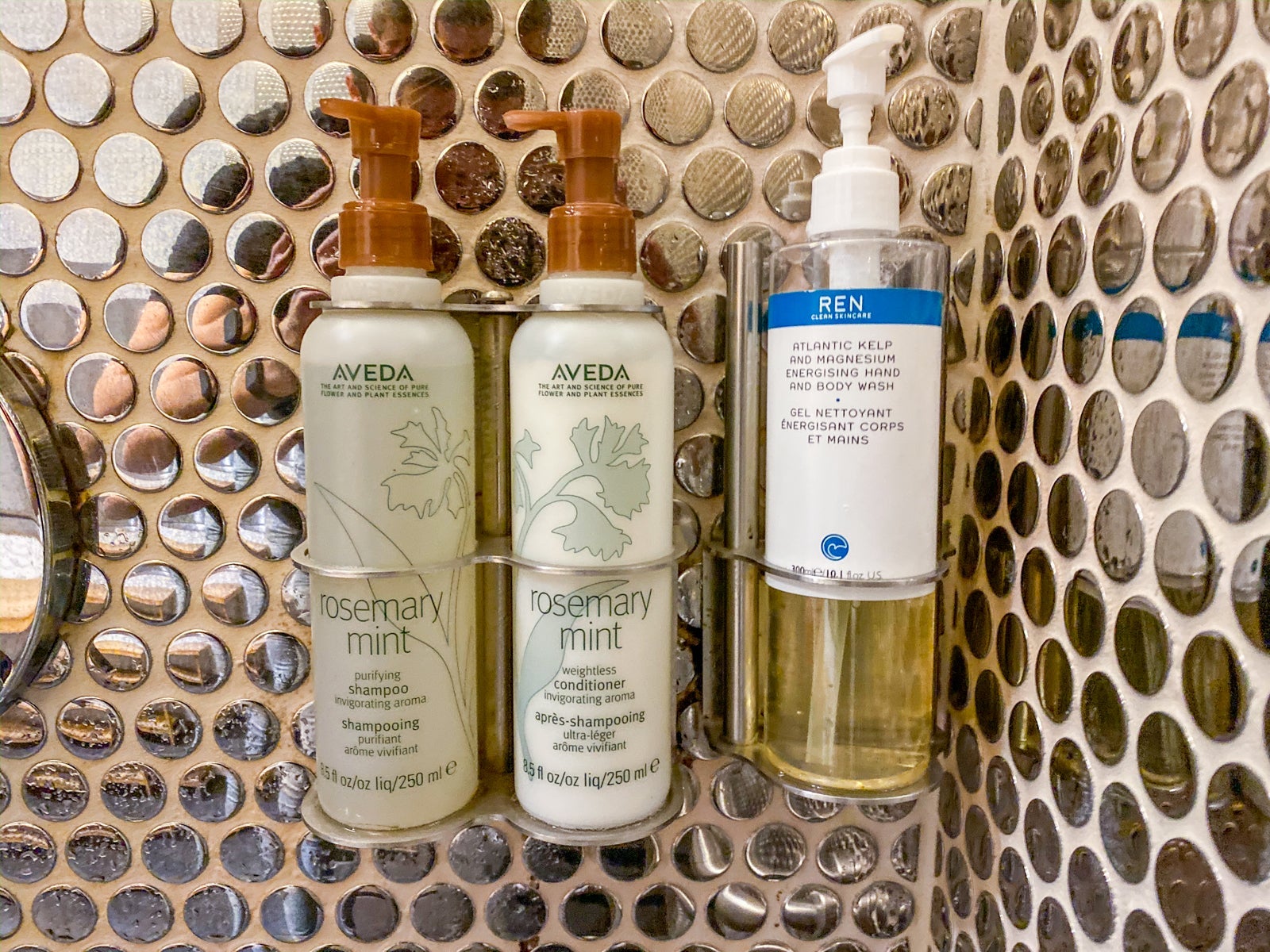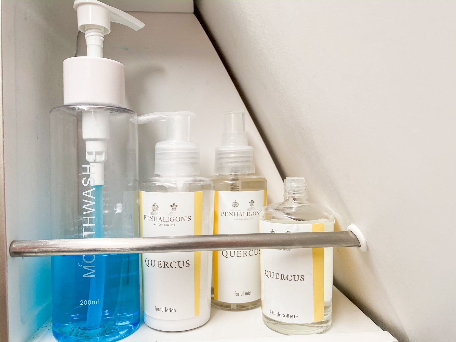 If you wanted traditional amenities, they were in the bathrooms. The lavs were stocked with single-use mouthwash, toothbrushes, shaving kits, combs and hairbrushes. There was also a shared bottle of eau du toilette, facial mist and hand lotion made by the British perfume house Penhaligon's in each restroom.
