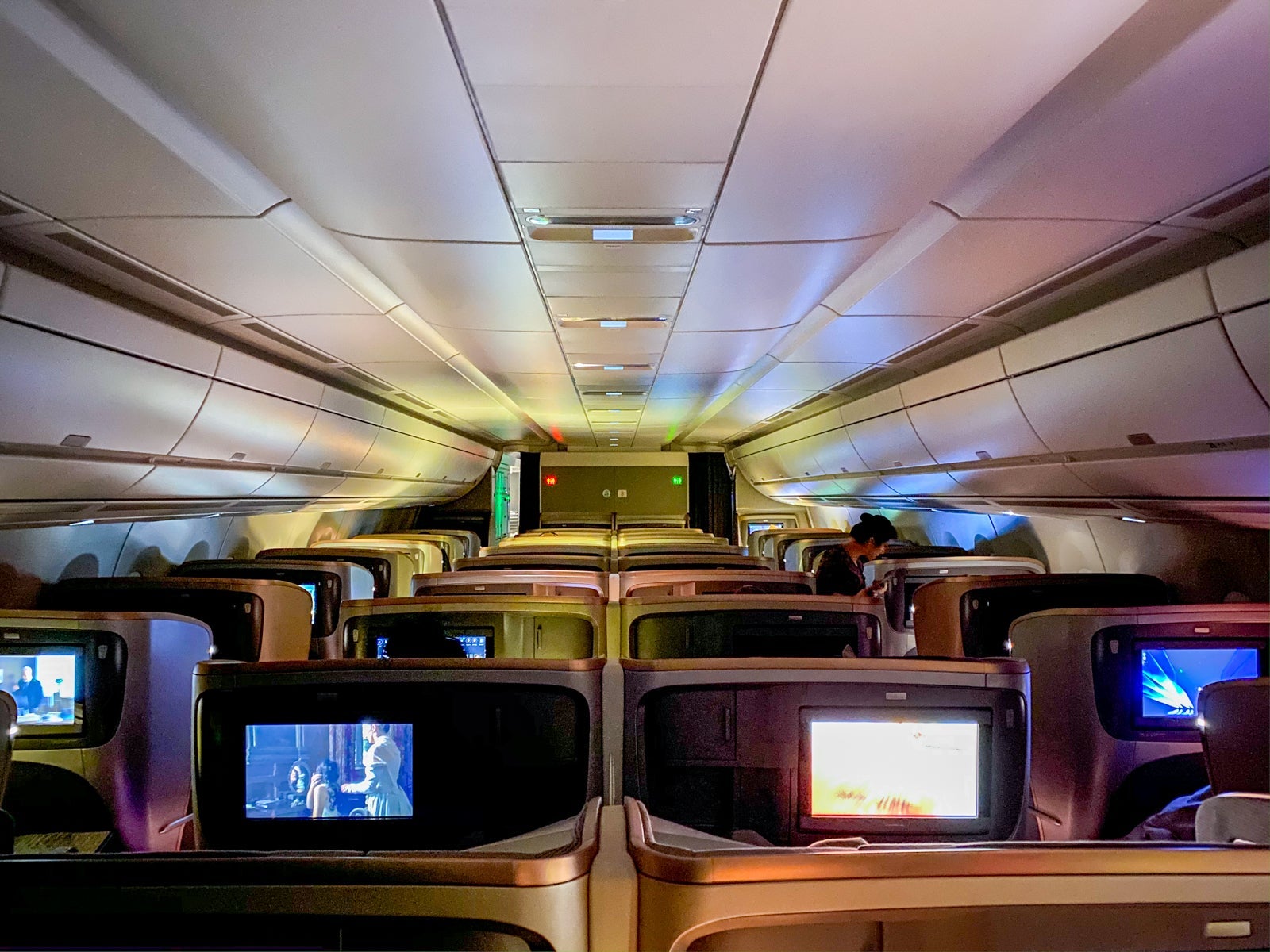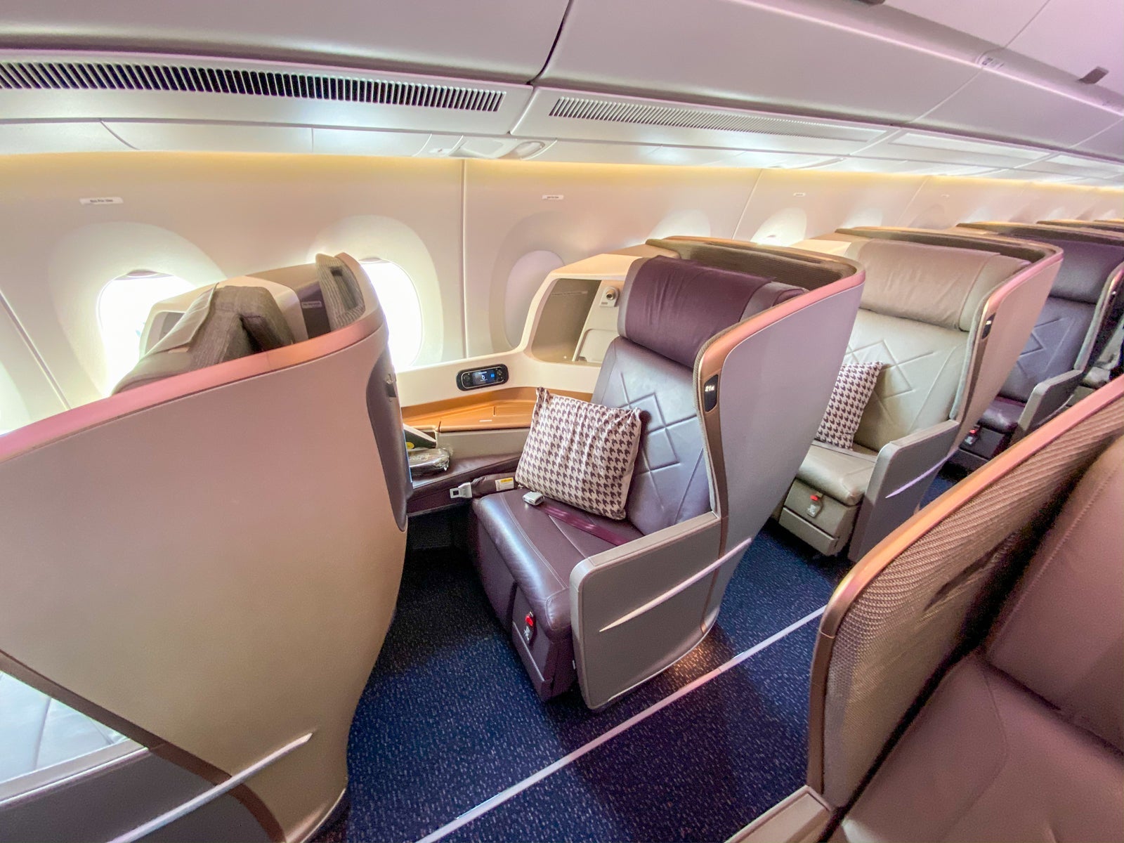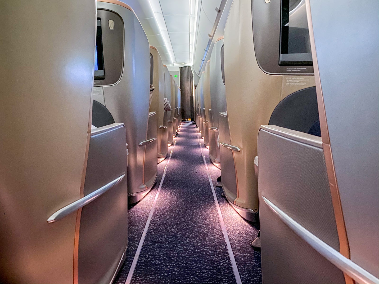 Singapore's business-class cabins on the A350 are really sleek and visually appealing. Seats are in a 1-2-1 configuration and split across two cabins. The cabin feels incredibly spacious, thanks to the lack of overhead bins in the middle of the plane.