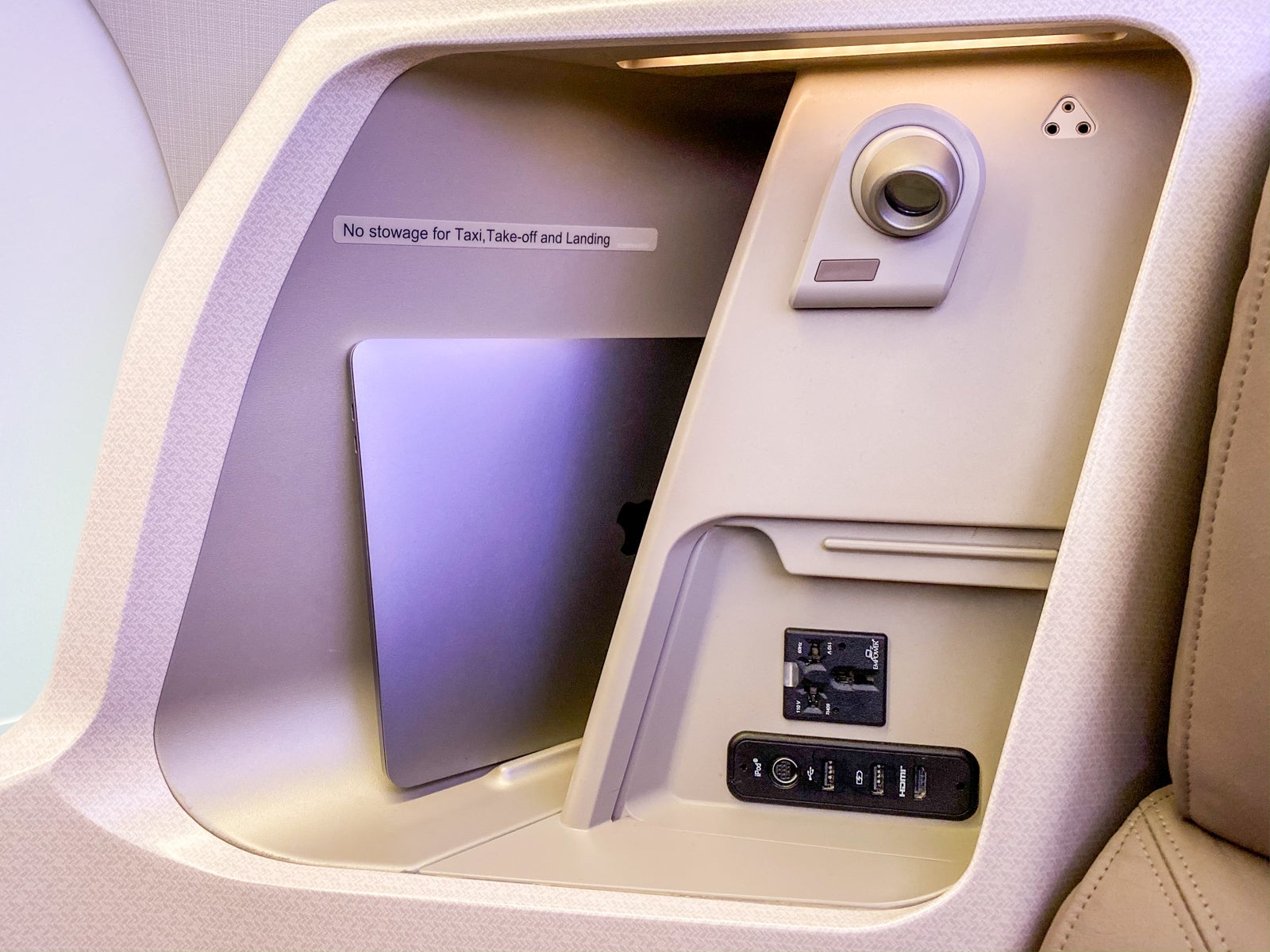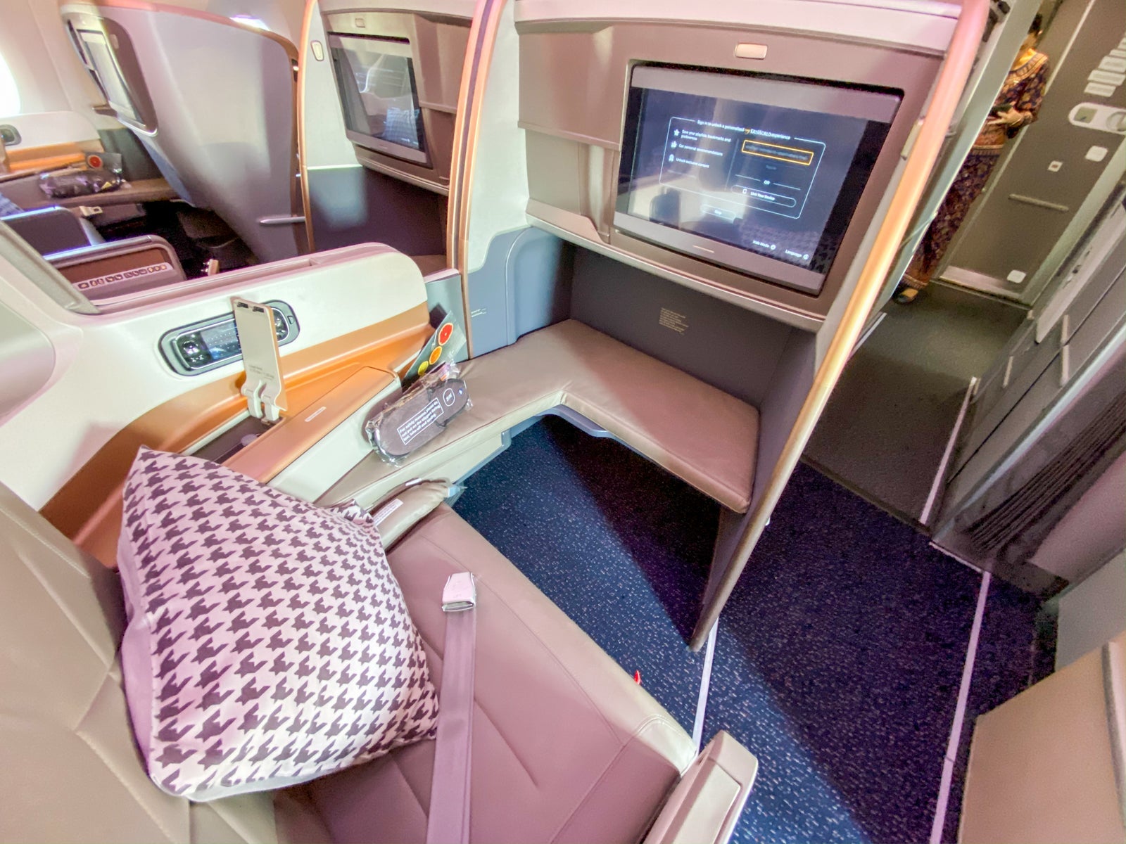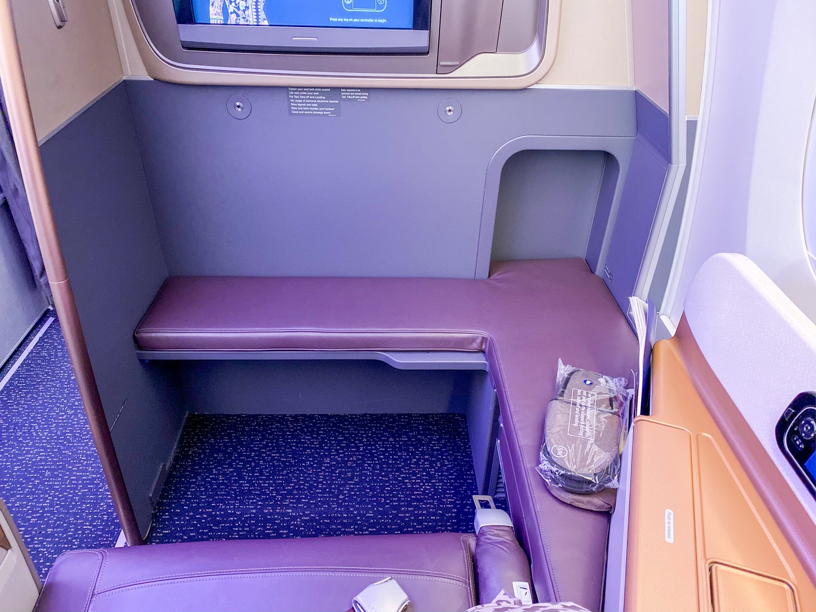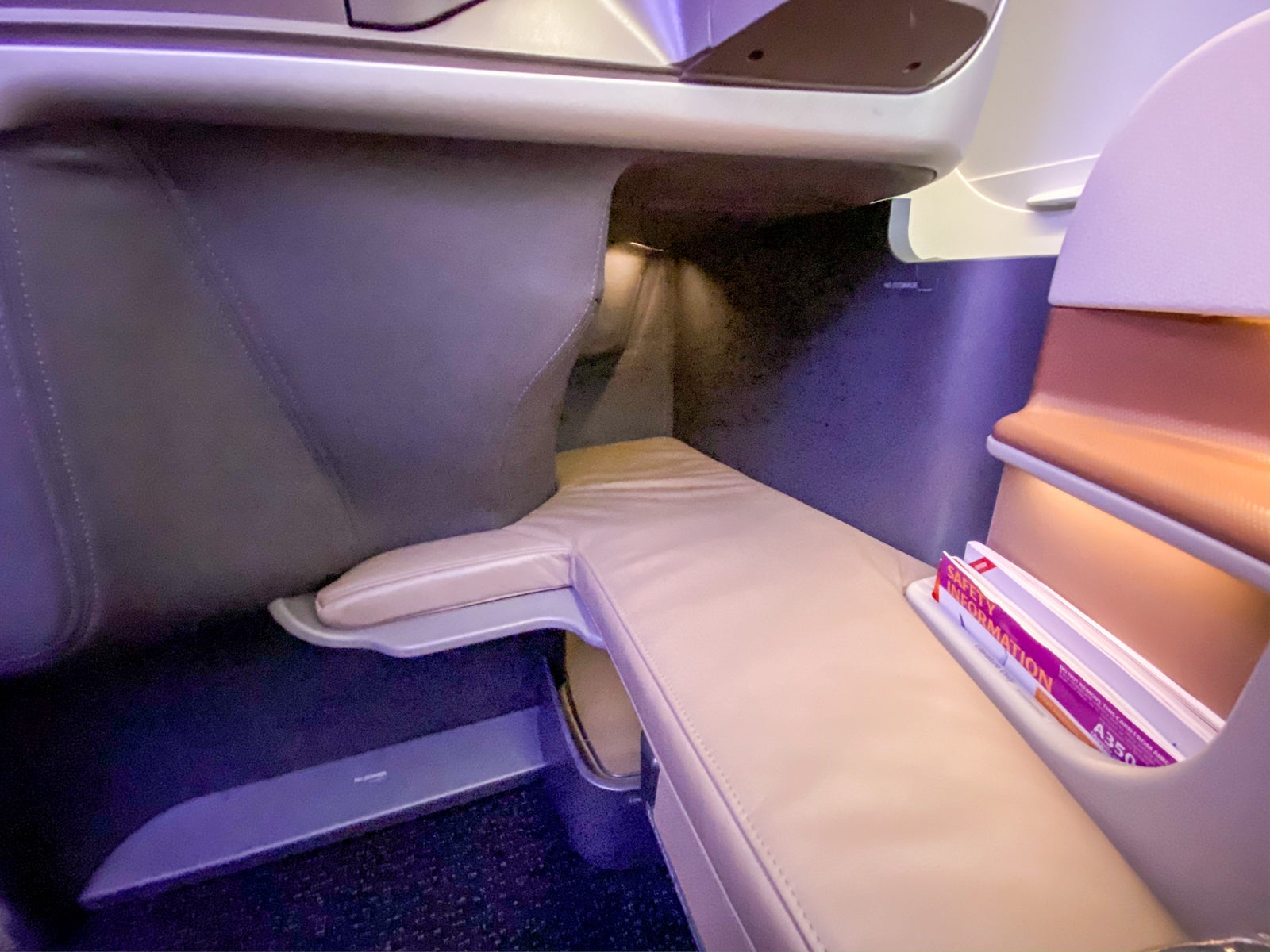 Overall, the seats definitely look prettier than they are comfortable. The seat and bed are quite hard, the footwell is tiny and awkwardly positioned, and the seat doesn't recline much. Though the oversized width compensates for some of the seat's flaws, I'd still prefer a reverse-herringbone seat over the ones Singapore installed on the Airbus A350-900ULR.