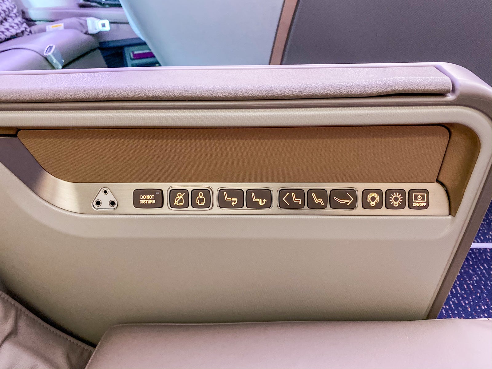 The self-explanatory seat controls are on the armrest closest to the aisle.