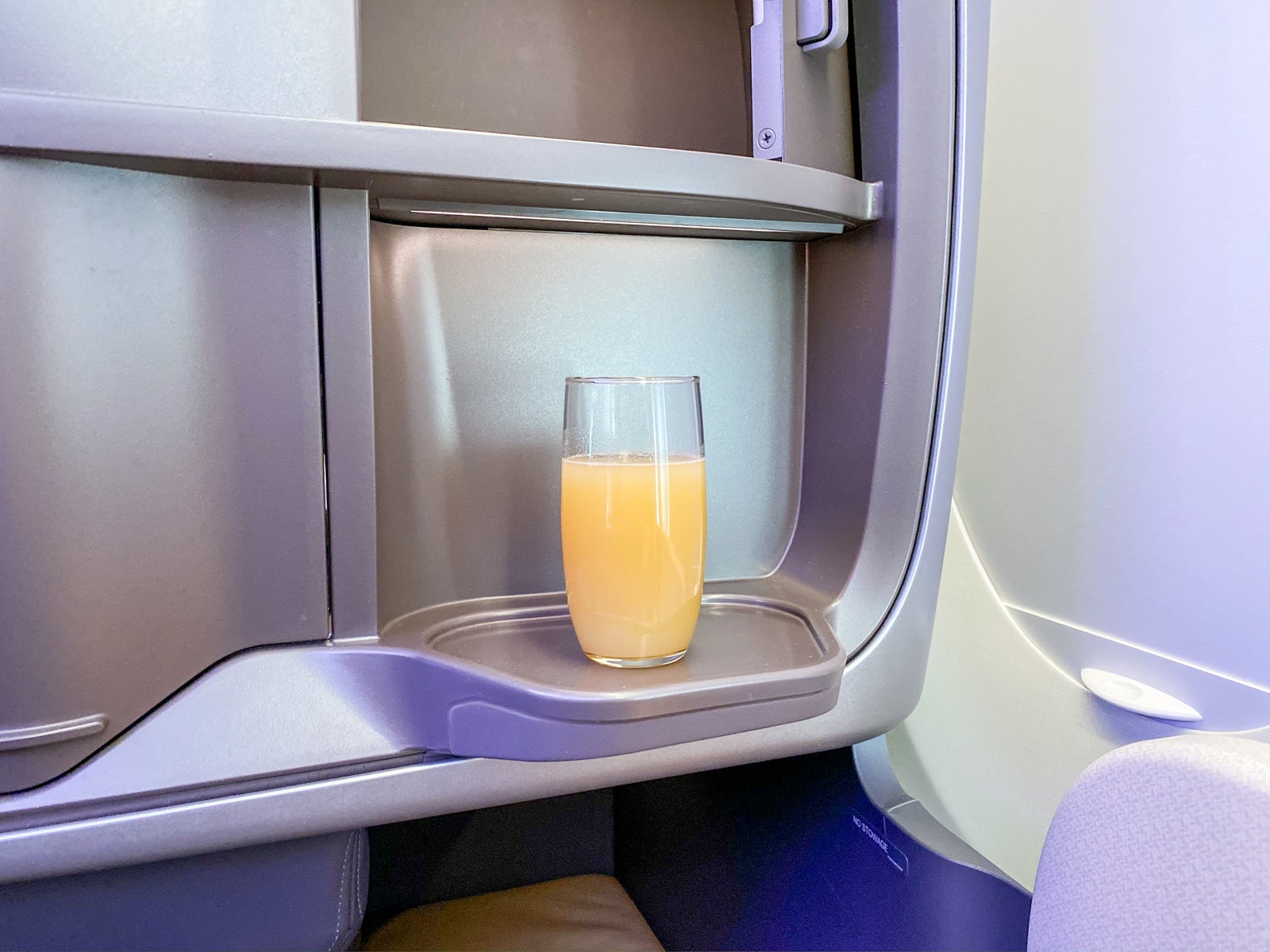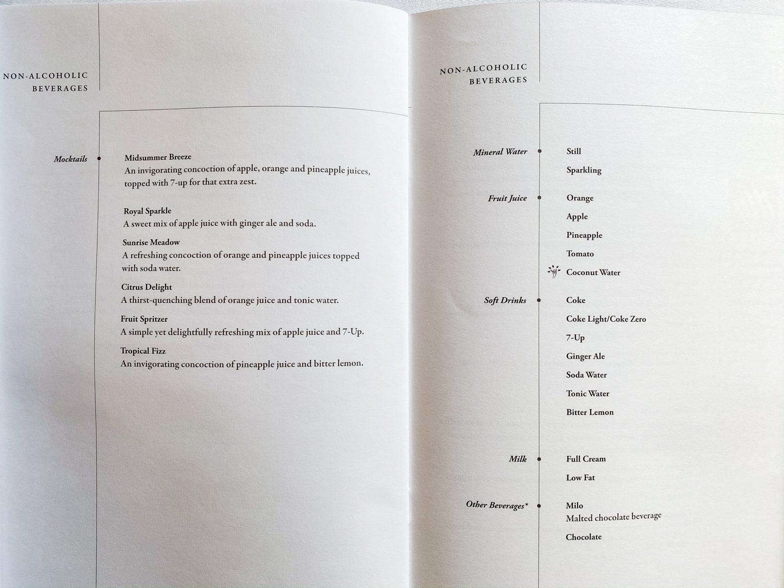 Once I got seated, the flight attendant serving my aisle came through with a tray of predeparture drinks. Singapore didn't serve liquor on the ground, but I knew I'd have plenty once airborne, so I selected the coconut pineapple agua fresca — definitely a refreshing way to start the voyage.