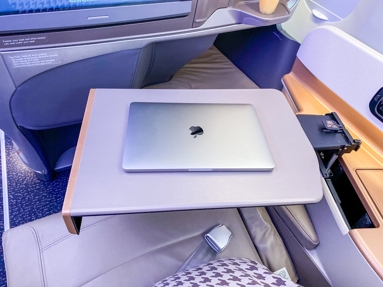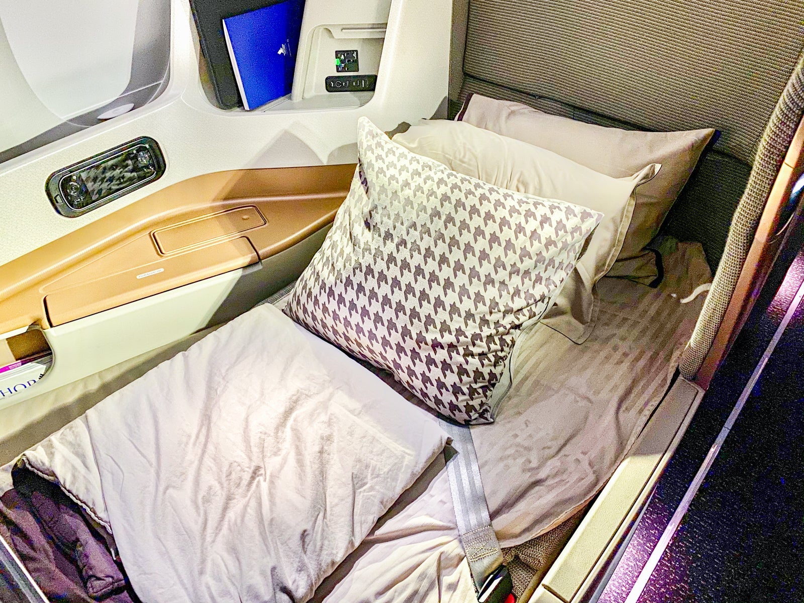 There was one plush pillow on the seat during boarding. Flipping the seat into bed mode revealed two other similarly sized pillows, as well as a thin mattress pad and duvet. While the mattress pad and duvet were of average quality, I loved that Singapore gave three plush pillows. It made all the difference in getting somewhat comfortable on the otherwise hard bed.