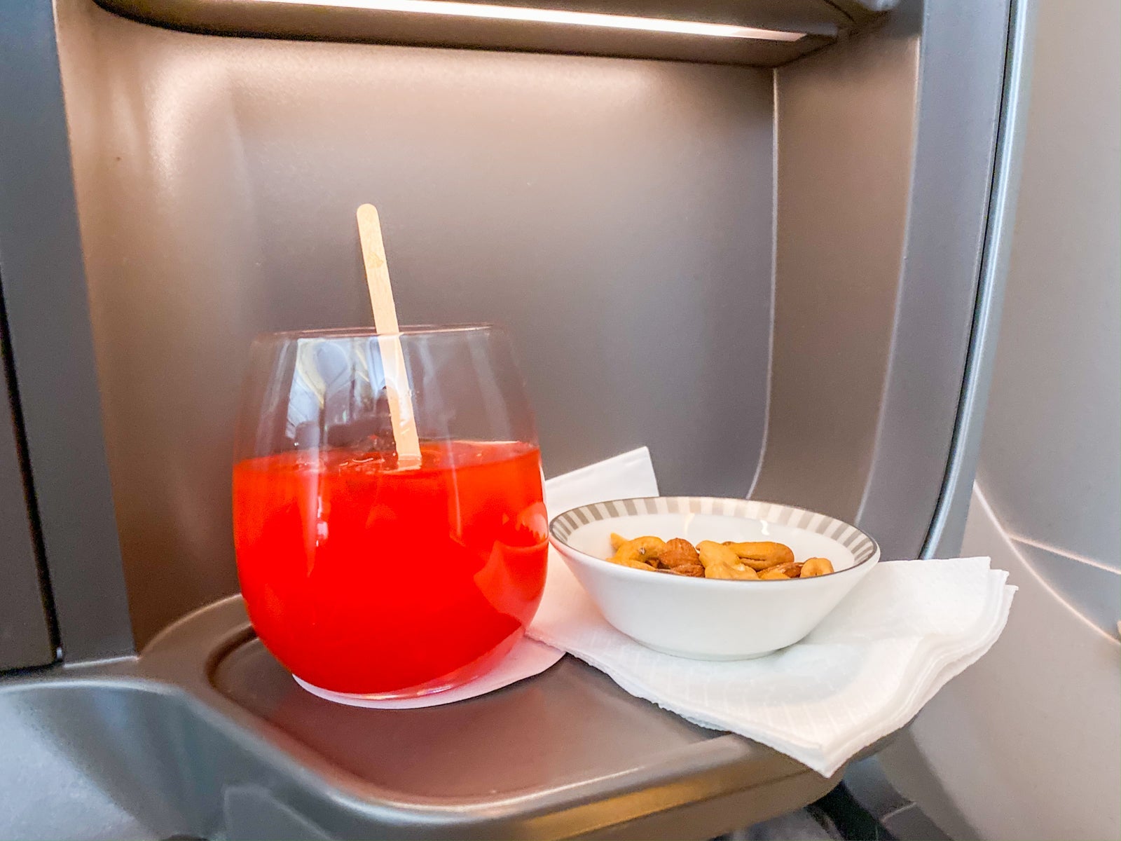 Once we hit our initial cruising altitude, flight attendants came through taking drink and meal orders. I had the famous Singapore sling, which was served alongside warm nuts.