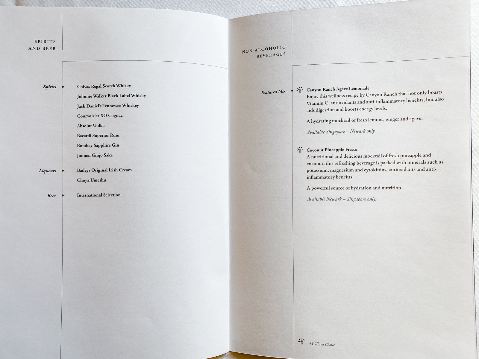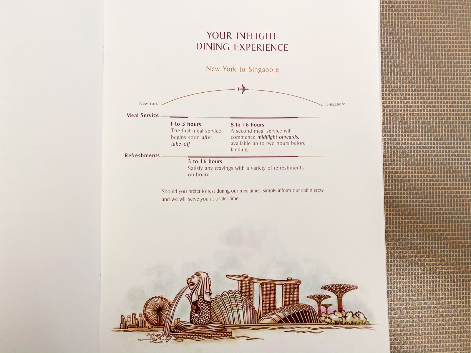 As we were on our climb out, I browsed the menu for the flight. Singapore outlines the dining schedule in the menu, and I was happy to see that there was a meal right after departure, as well as a second meal on demand anytime between eight and 16 hours into the flight. Refreshments were always available on demand after the first meal service was completed.
