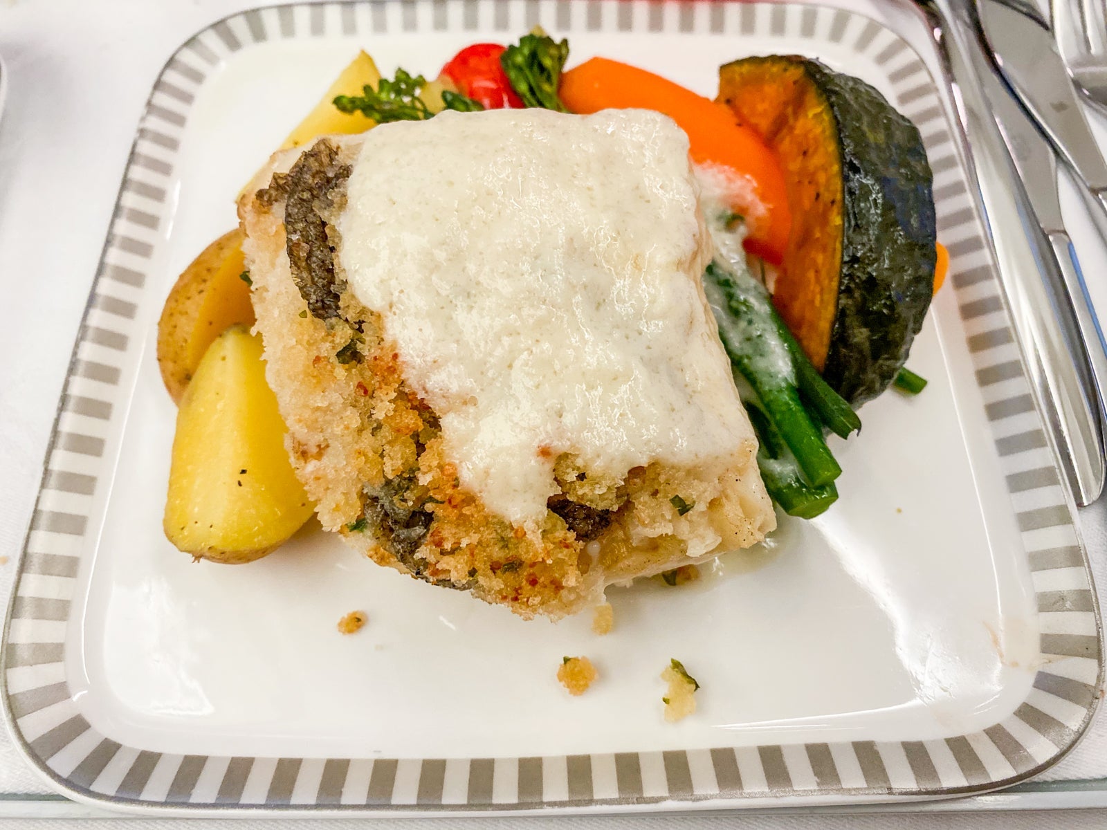The main was served about 90 minutes after takeoff. The baked, cheese-herb-crusted halibut filet was a tad too tough. At least the vegetable medley and potato side were delicious.
