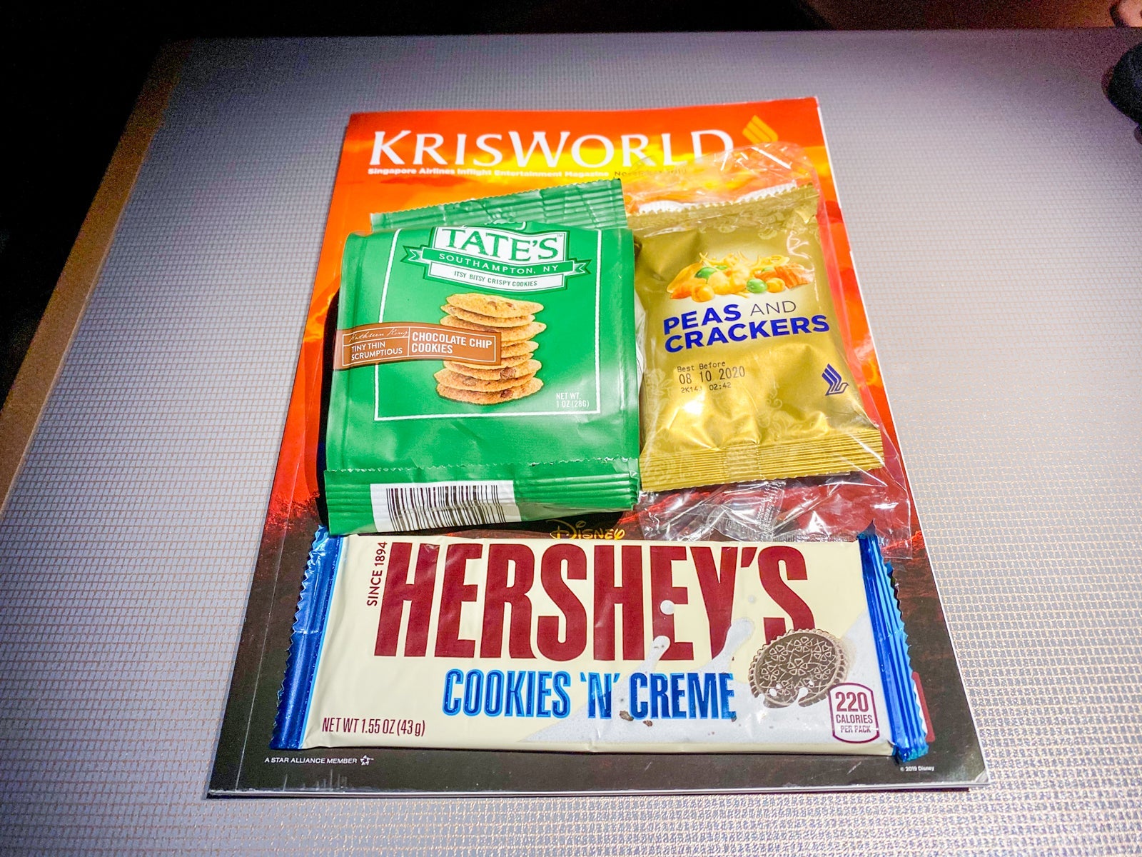 I started by perusing the snack basket. I took SunChips and nuts, which satisfied my salt craving. But then I started craving something sweet, so I raided the snack basket again, this time for a bag of Tate's cookies, a Hershey's cookies-and-creme bar and an unbranded package of peas and crackers.