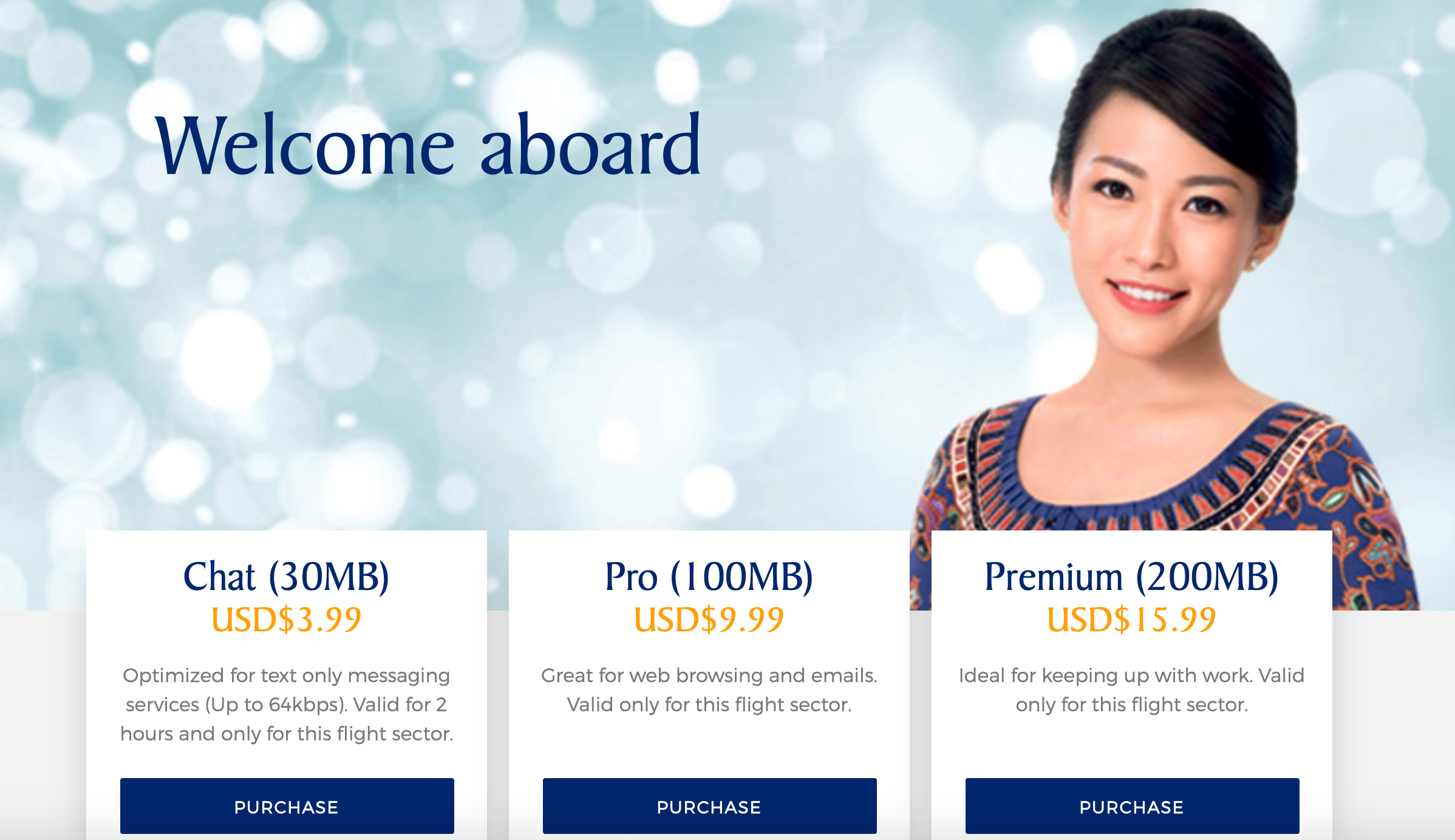 Business-class passengers got 100 MB of free Wi-Fi, and any additional data cost extra. Singapore charges based on usage, as opposed to time, which is really frustrating. I purchased a 200 MB package of Wi-Fi for $15.99, and I was through with the pass within 30 minutes. Expect a hefty bill if you're looking to stay connected for most of the flight.
