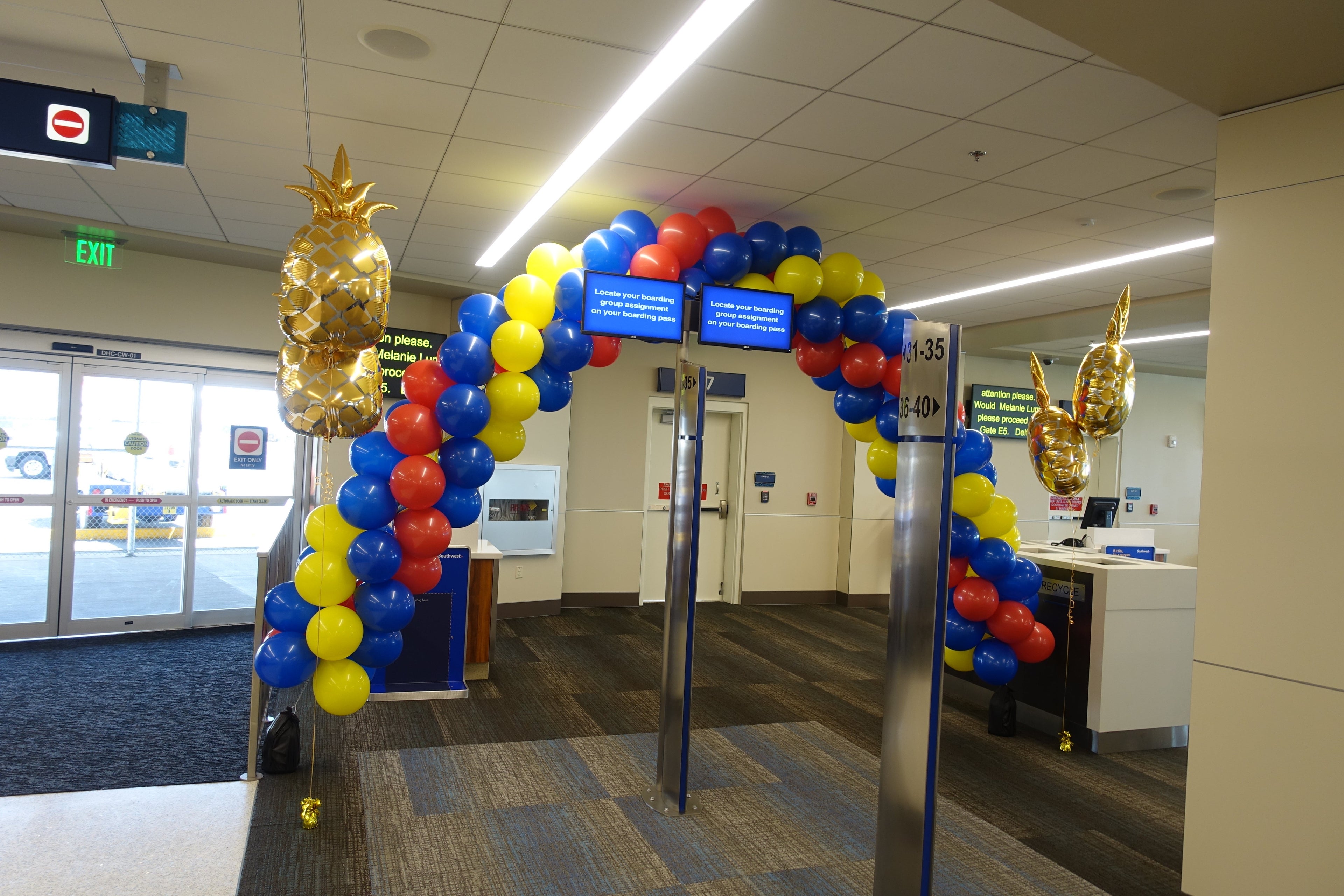 There were festive touches around the gate area to mark the airline's first passenger flight out of Honolulu. A balloon arch adorned our departure gate, G7.