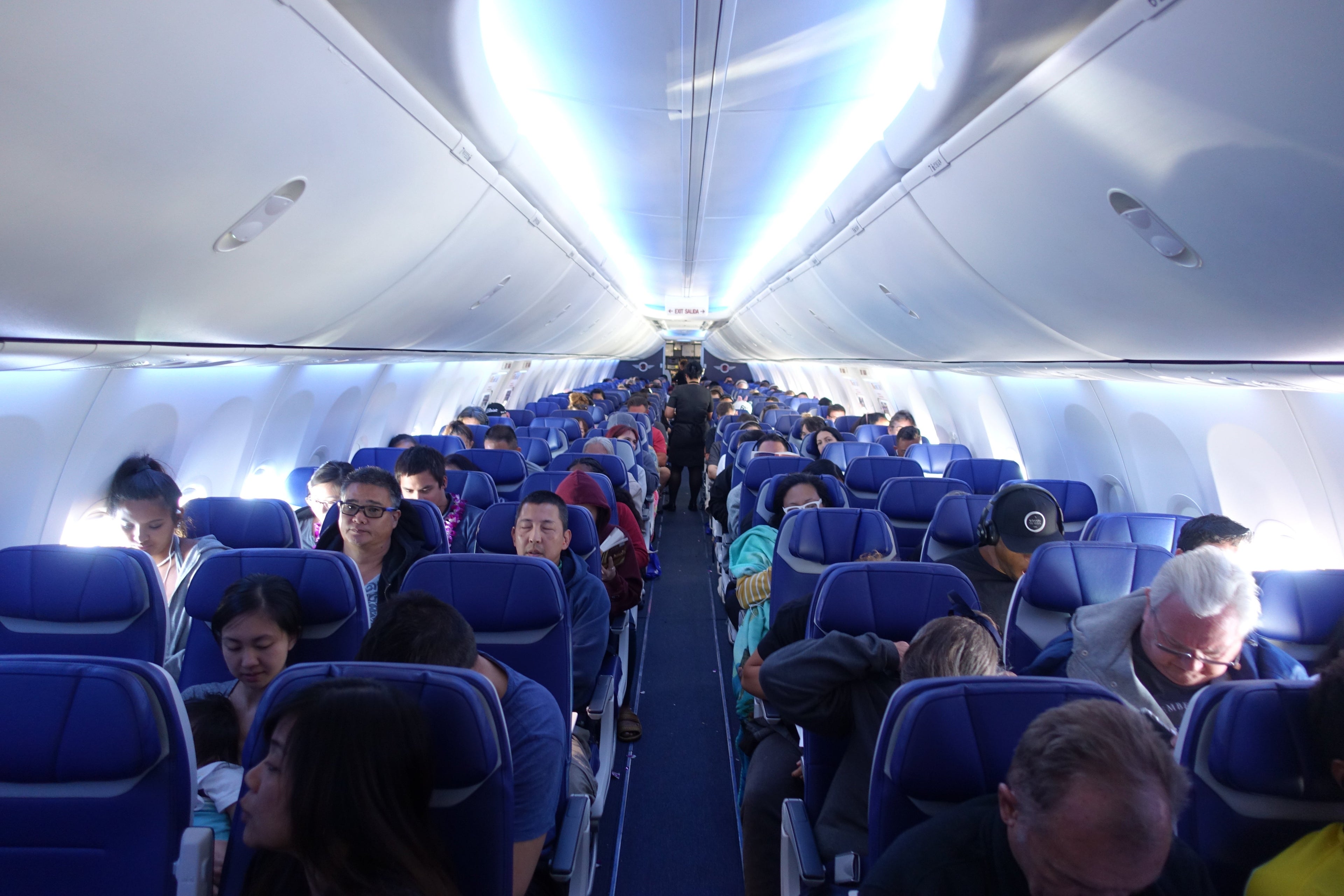 The flight was completely sold out, with all 175 seats full. In the revelry of the inaugural flight to Hawaii on Sunday, I forgot to check in for my return flight, so I was in the dreaded "C" boarding group, which usually translates to a middle seat in the back of plane. But by the grace of the aviation gods, I was still able to find an aisle seat in the fourth row and overhead bin space for my rollaboard bag. A true miracle on this jam-packed flight!