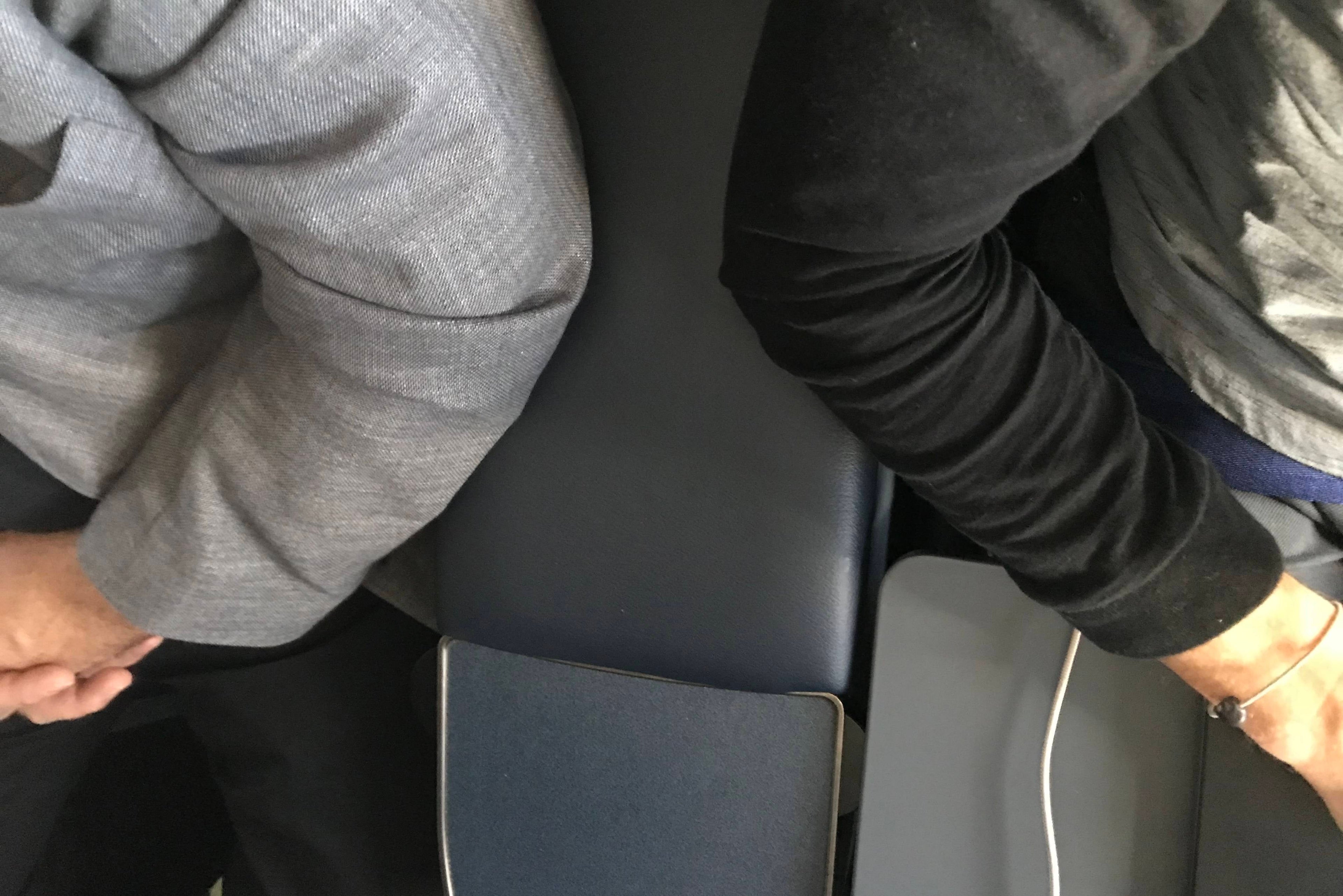 I'm 5 feet, 10 inches, and the 34-inch pitch was plenty — enough to even cross my legs. The 20-inch seat width was also roomy and comfy. Even the appearance of the chairs, which widened toward the top, resembled other first domestic first-class seats. The middle armrest was plenty big for both me and the aisle passenger.