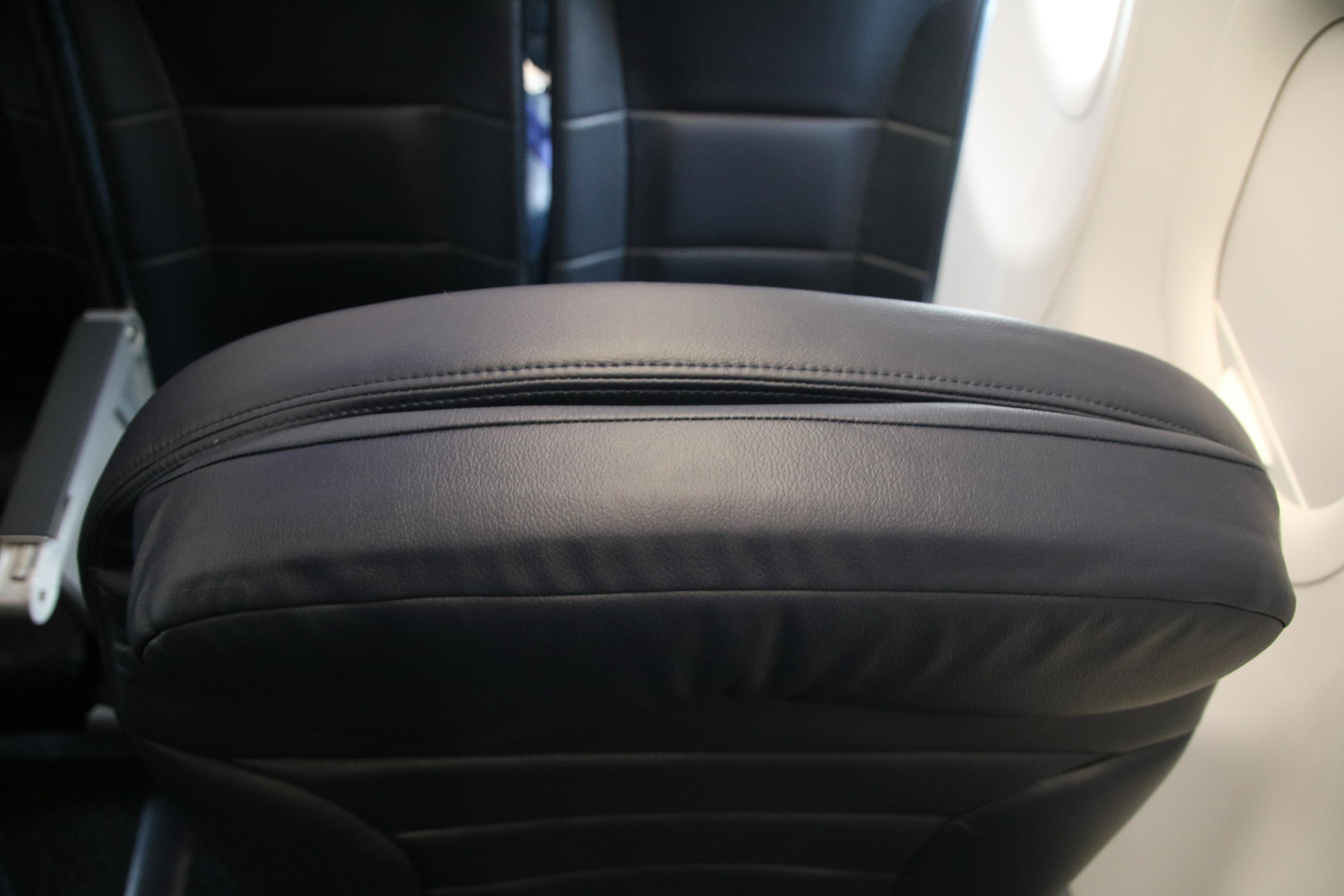 None of this made sense to me. While I'm not a fan of the lack of recline in regular economy, I understand they do this to cram as many seats into the aircraft as possible. But the couple inches total it would take to add recline to these front seats could be taken from Row 1's legroom, and an adjustable headrest takes no extra room. Perhaps it's to save money on the cost of the seat itself, but there are so few Big Front Seats across the entire airline that the repeat comfort benefit from a one-time expense seems worth it to me.