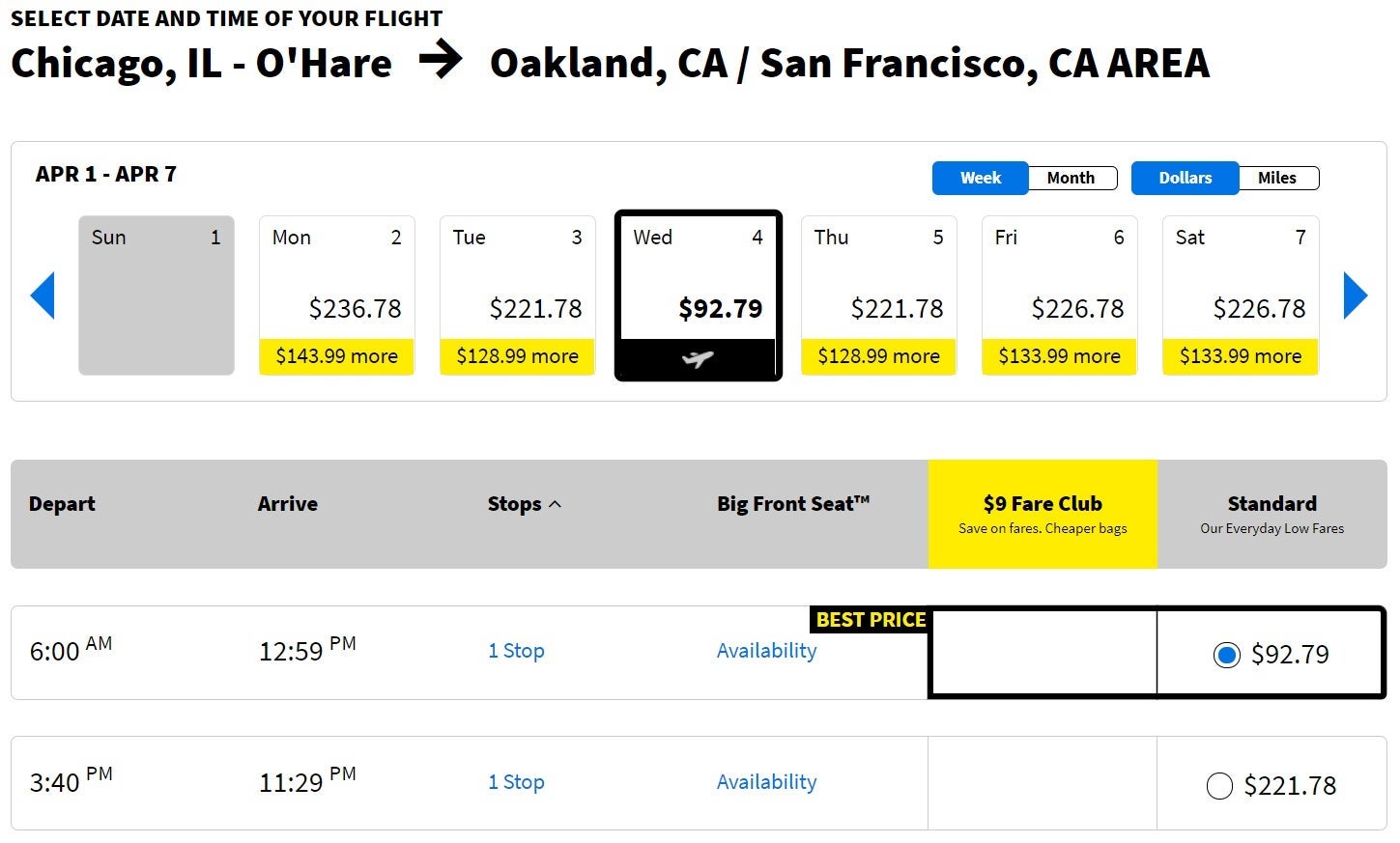 The task was to book a flight from Chicago to the Bay Area five days in advance. As expected during spring break, there were no cheap options, with one exception: Chicago O'Hare (ORD) to Los Angeles International (LAX) to Oakland International (OAK) on Spirit for $93.