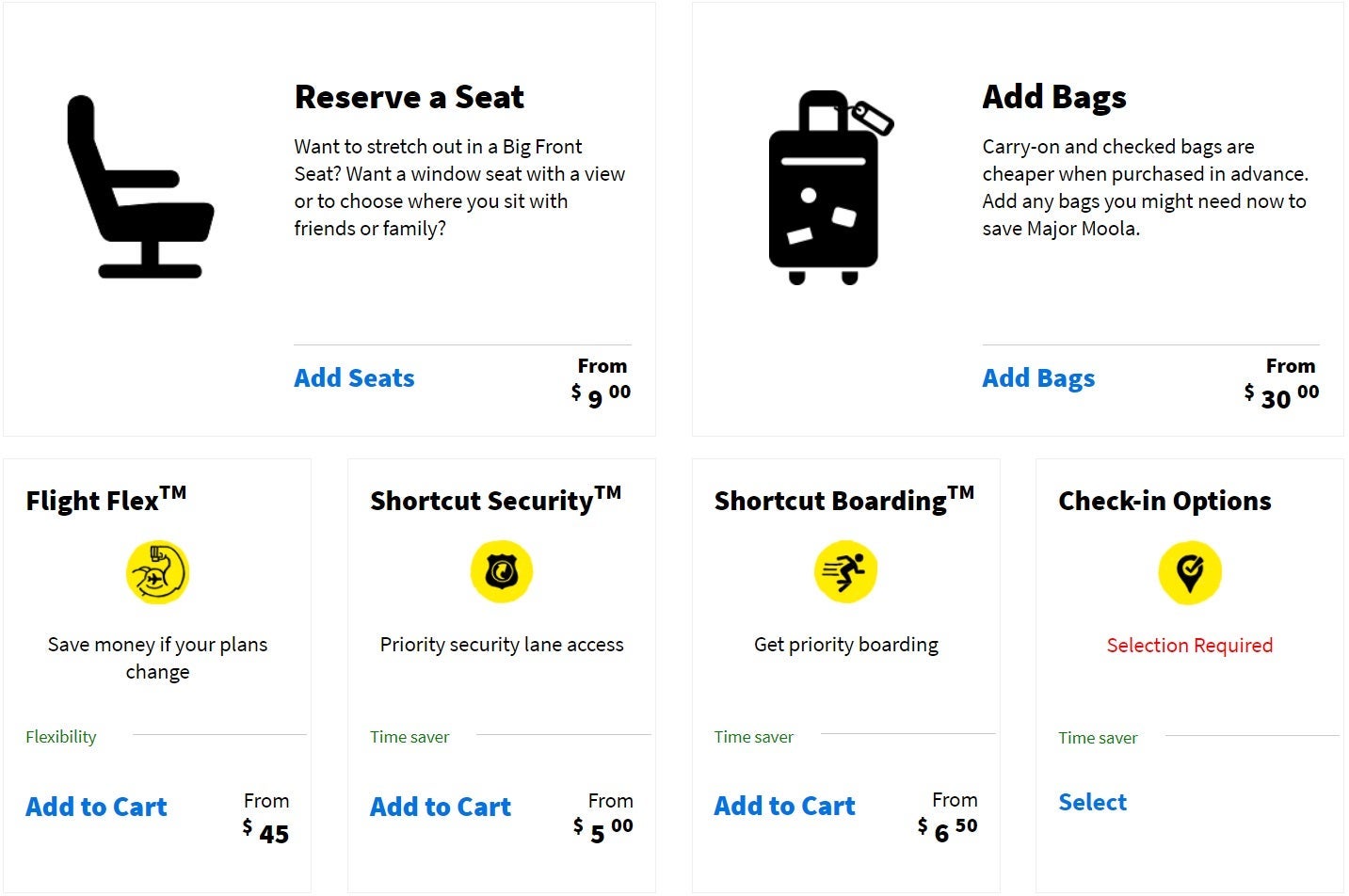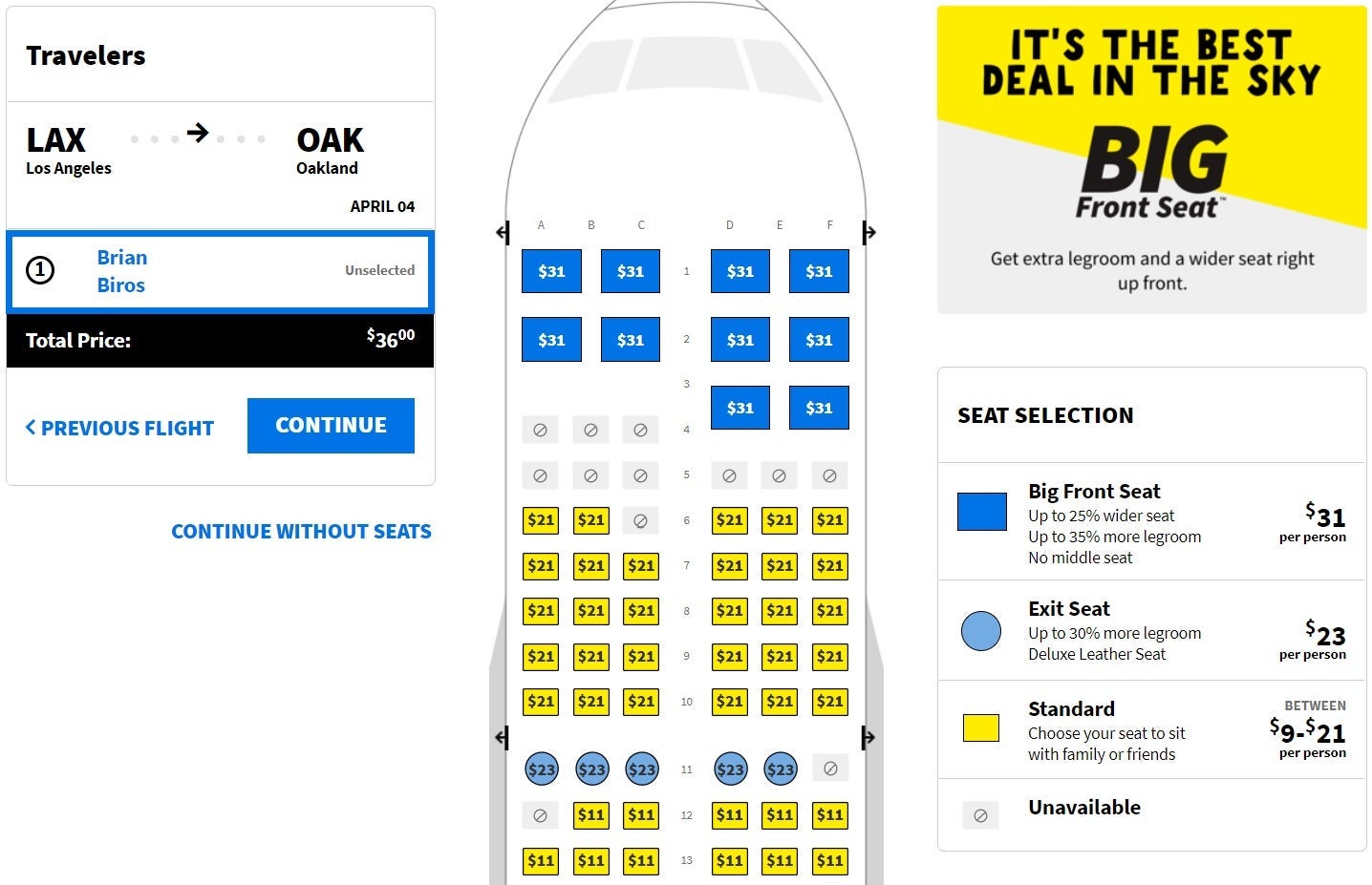The add-on I decided to investigate was seats. I've flown Spirit twice recently, and while I normally have no issues in economy, I find the airline's 28-inch pitch to be insufferable. To choose any seat, you'd have to pay at least $9, even for a middle seat at the back of the plane (which makes no sense to ever pay for as a solo traveler). But, the fee for the Big Front Seat was actually quite reasonable: