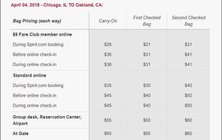 I disregarded the second row of upgrades all together, since I wouldn't need to switch my flight, already have TSA PreCheck, had priority boarding included with my seat and checked in for free using the airline's app. The most relevant option here for most passengers is baggage, as Spirit charges for both checked baggage and carry-on — and it's not cheap. Also, the price for baggage increases after booking and increases again at the airport. From my confirmation email, here's a comparison of the fees: