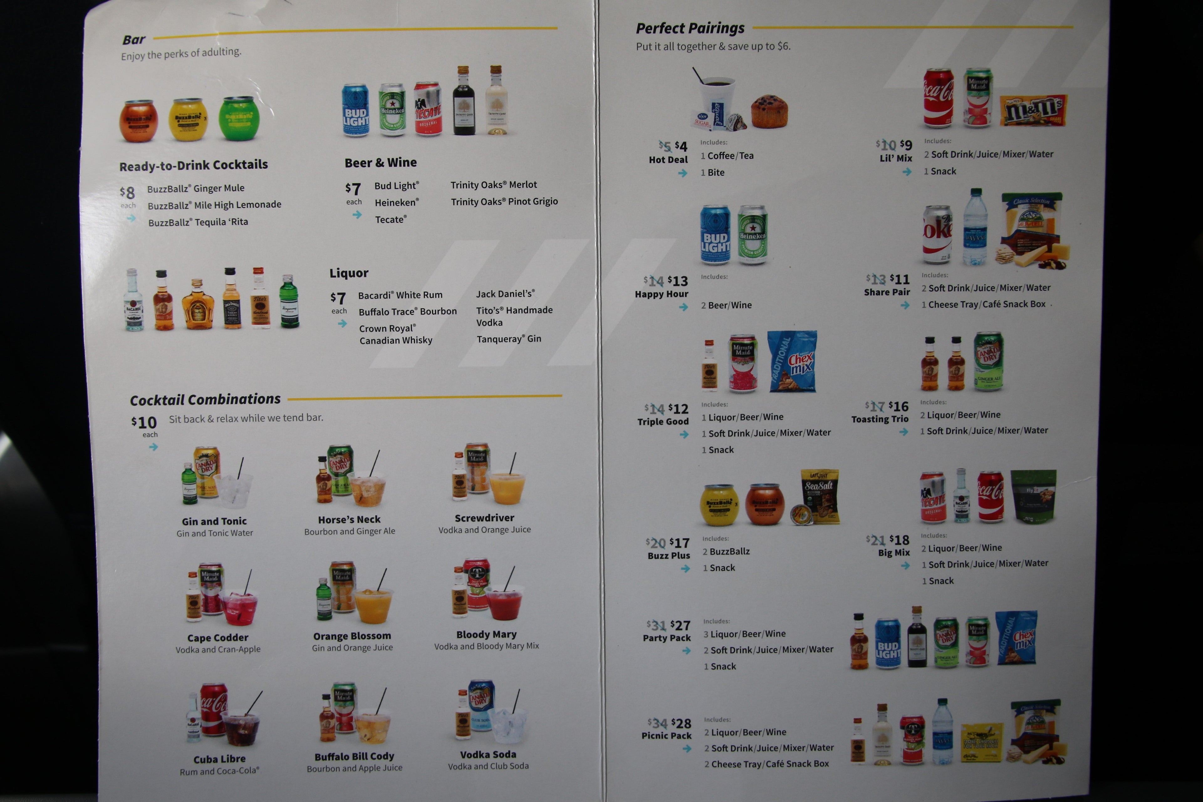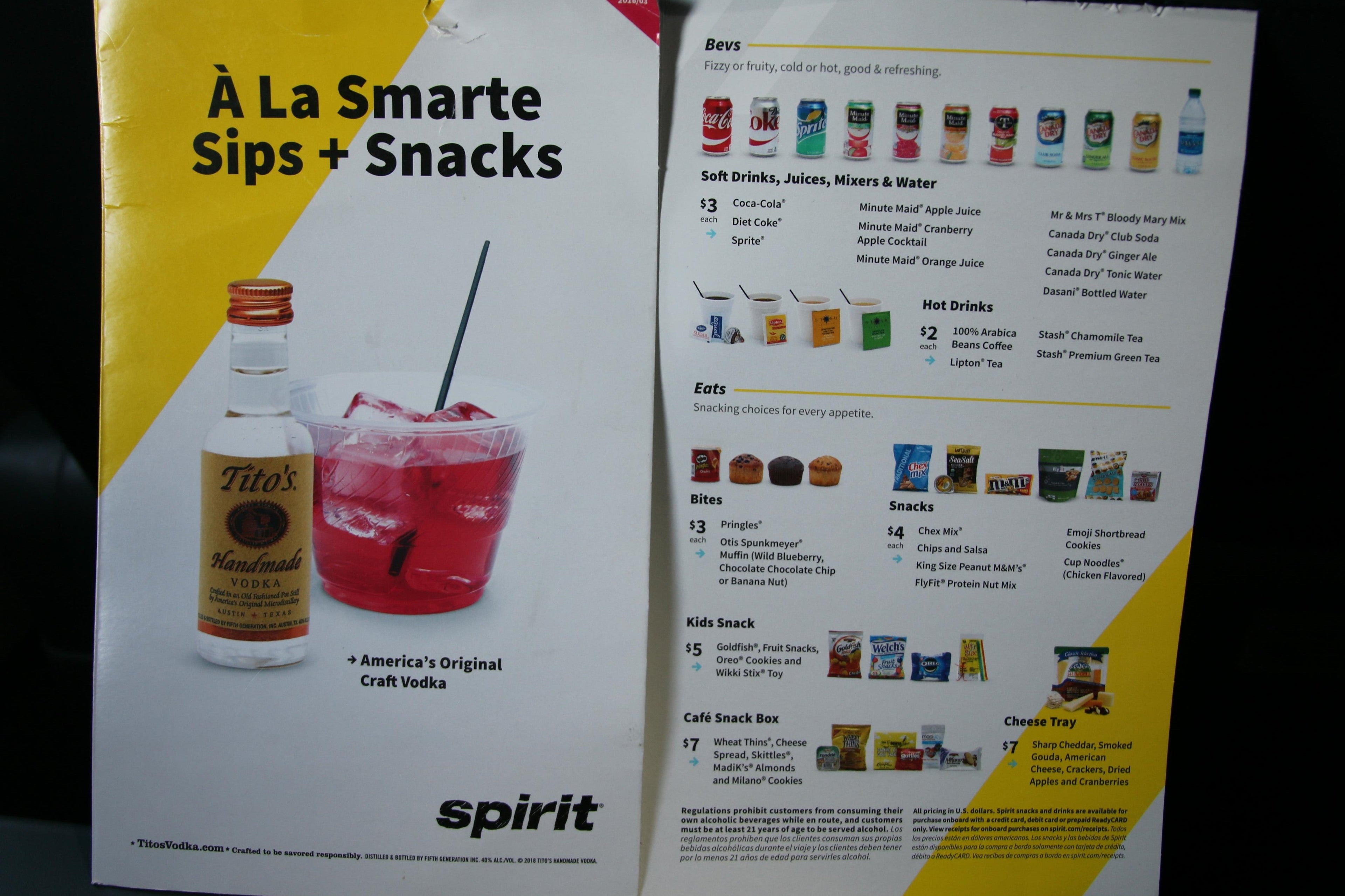 As expected with the most budget of US domestic airlines, nothing was included. Not even water. The normally free soft drink, coffee and water cost $2 to $3. There was also a menu of snacks and alcoholic beverages, with prices that matched other airlines.