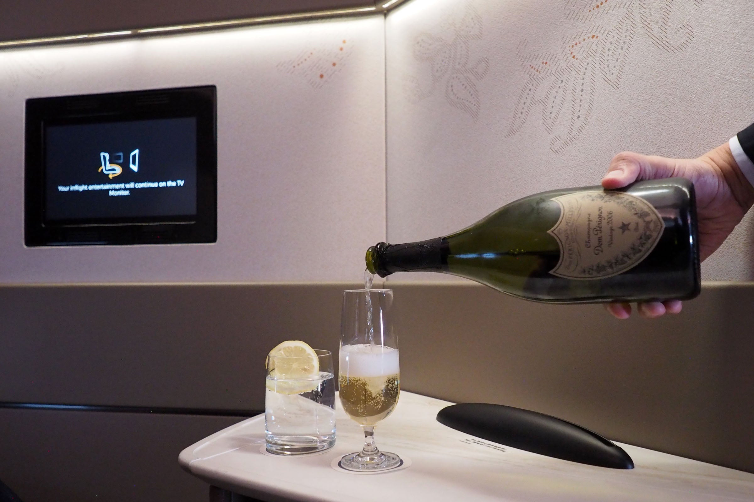Even though I had a big snack in the lounge, there was plenty more on the plane. I started with Dom and sparkling water before takeoff.