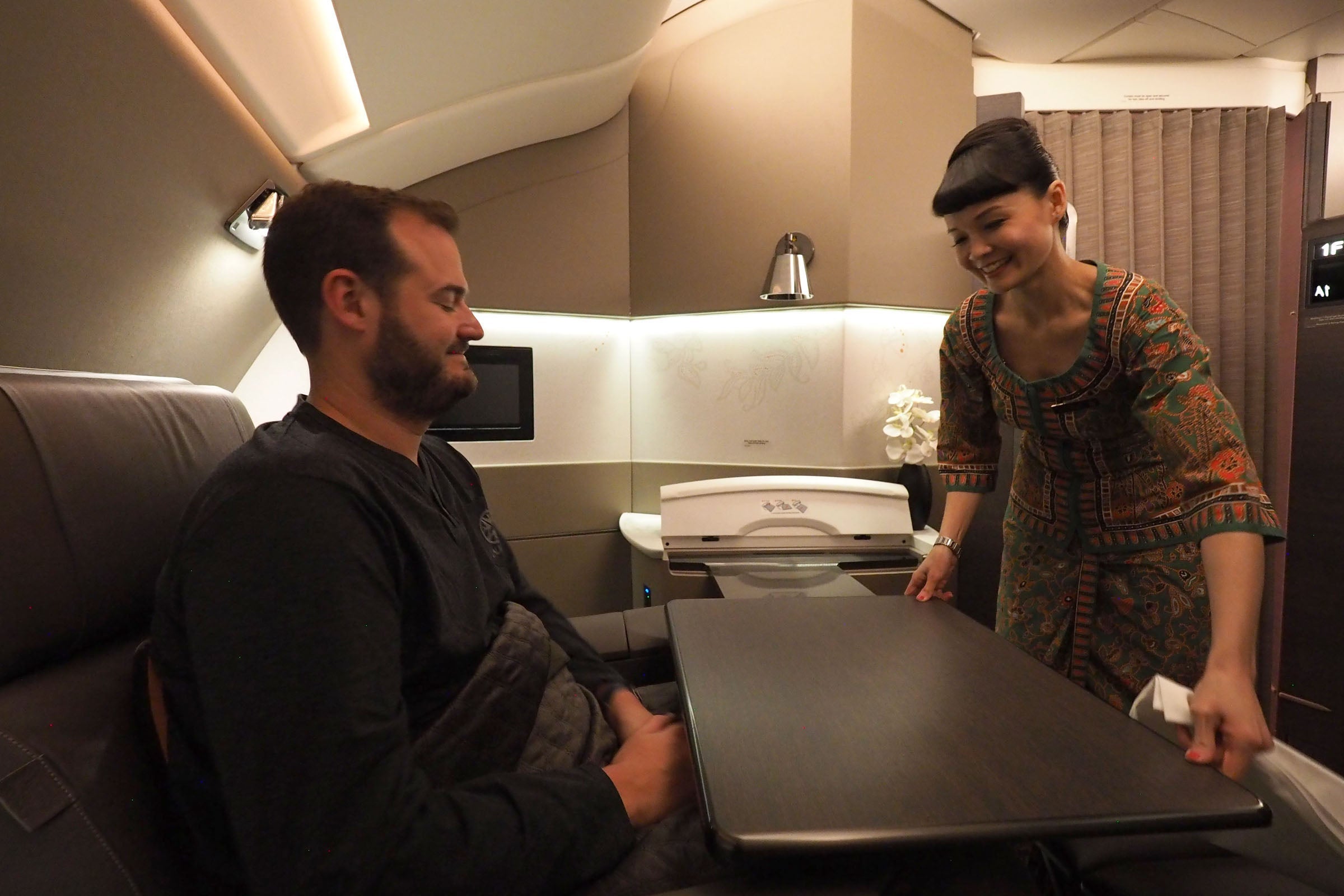 First, I should note that this wasn't an entirely ordinary flight. While we redeemed KrisFlyer miles for our tickets, per TPG policy, we needed to get permission in advance to film in the new suites cabin, so the airline knew I'd be onboard a couple weeks before departure. The crew wasn't handpicked for the occasion or anything like that, but there was a PR rep on board to bring TPG Editor-at-Large Zach Honig back and forth from business class to capture shots of me in the suite.