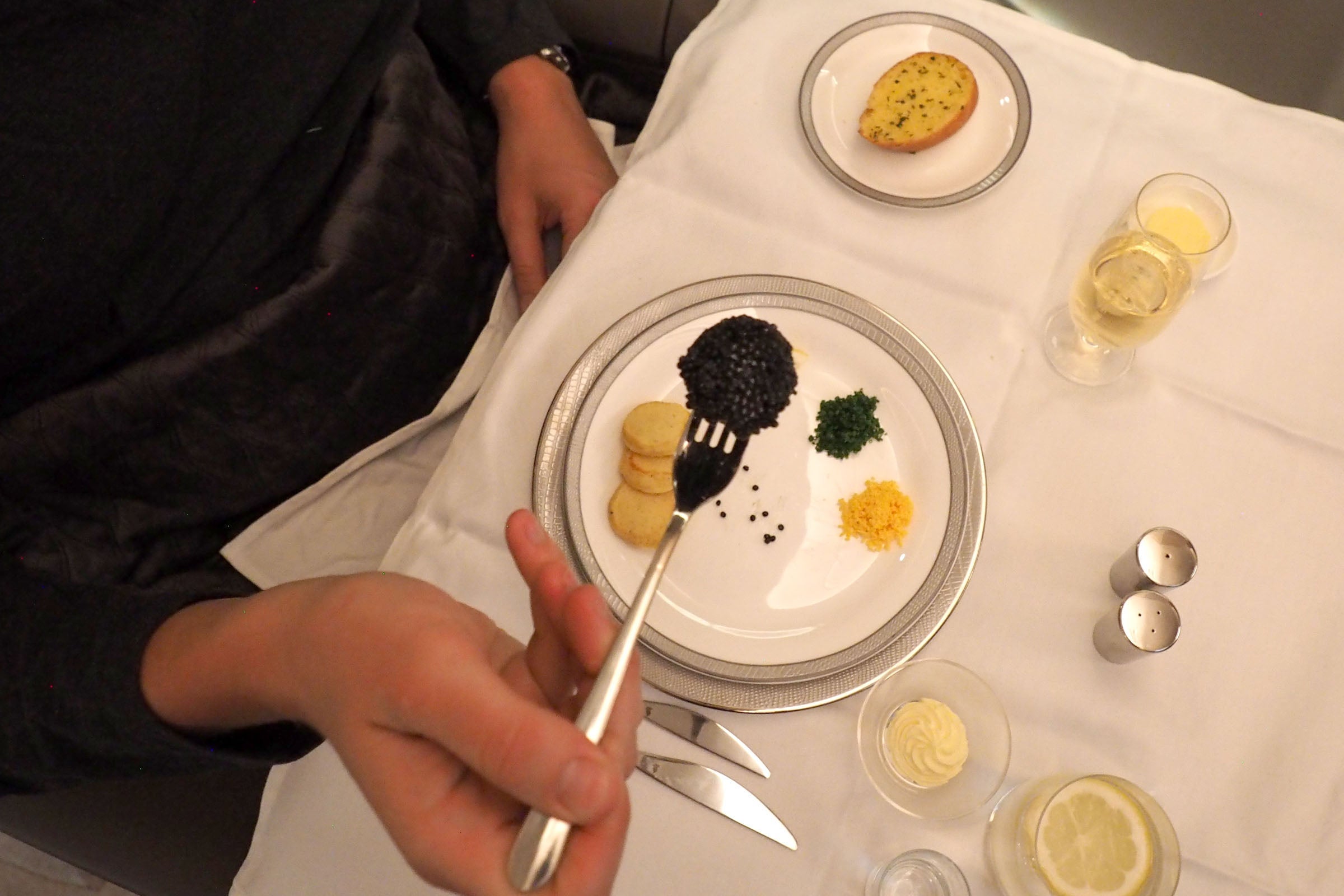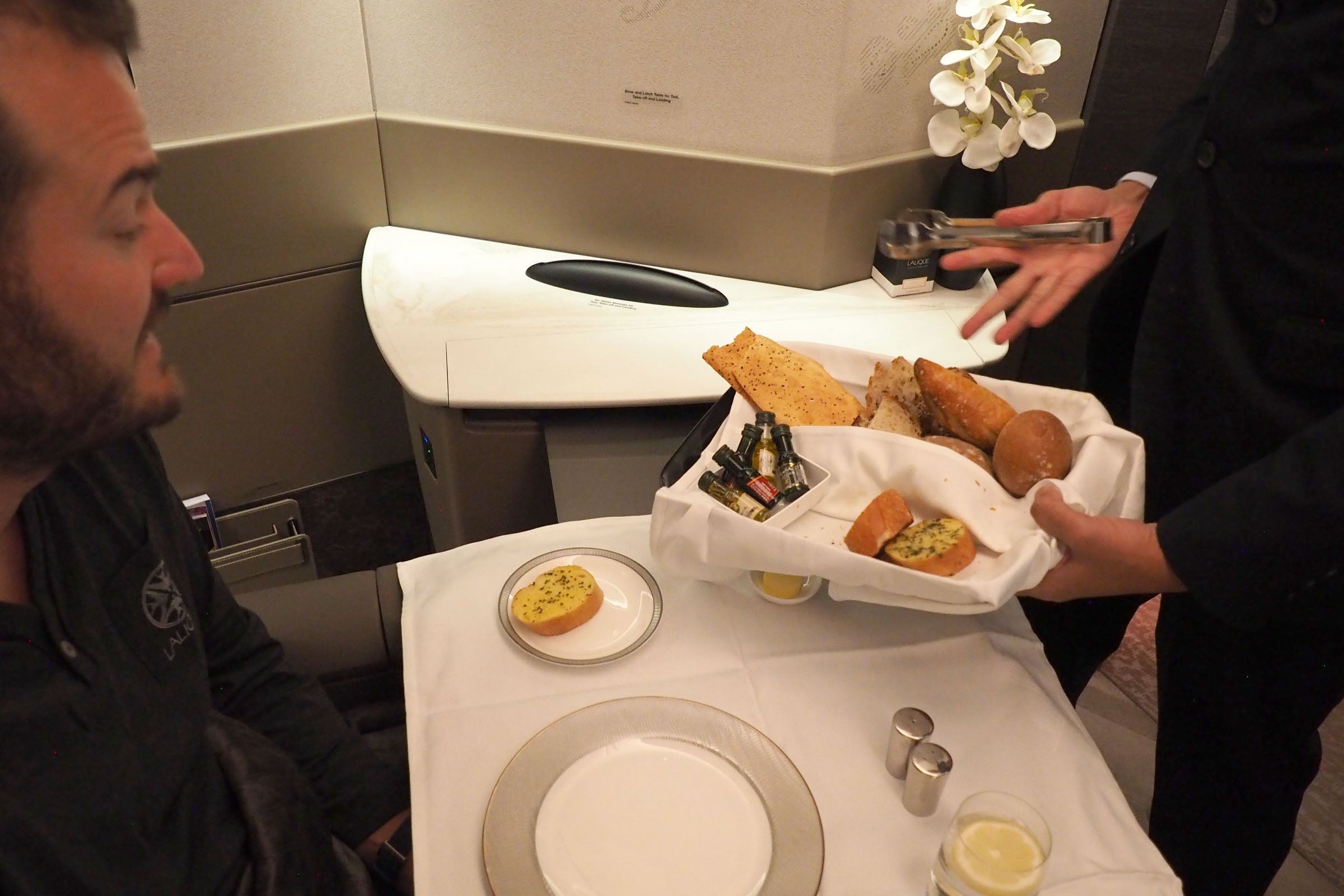 First-class passengers can dine on demand, so everything is served at your own pace. After changing into my pajamas I decided to begin the main meal service. Just check out that huge pop-out table! I definitely ended up needing all that space.