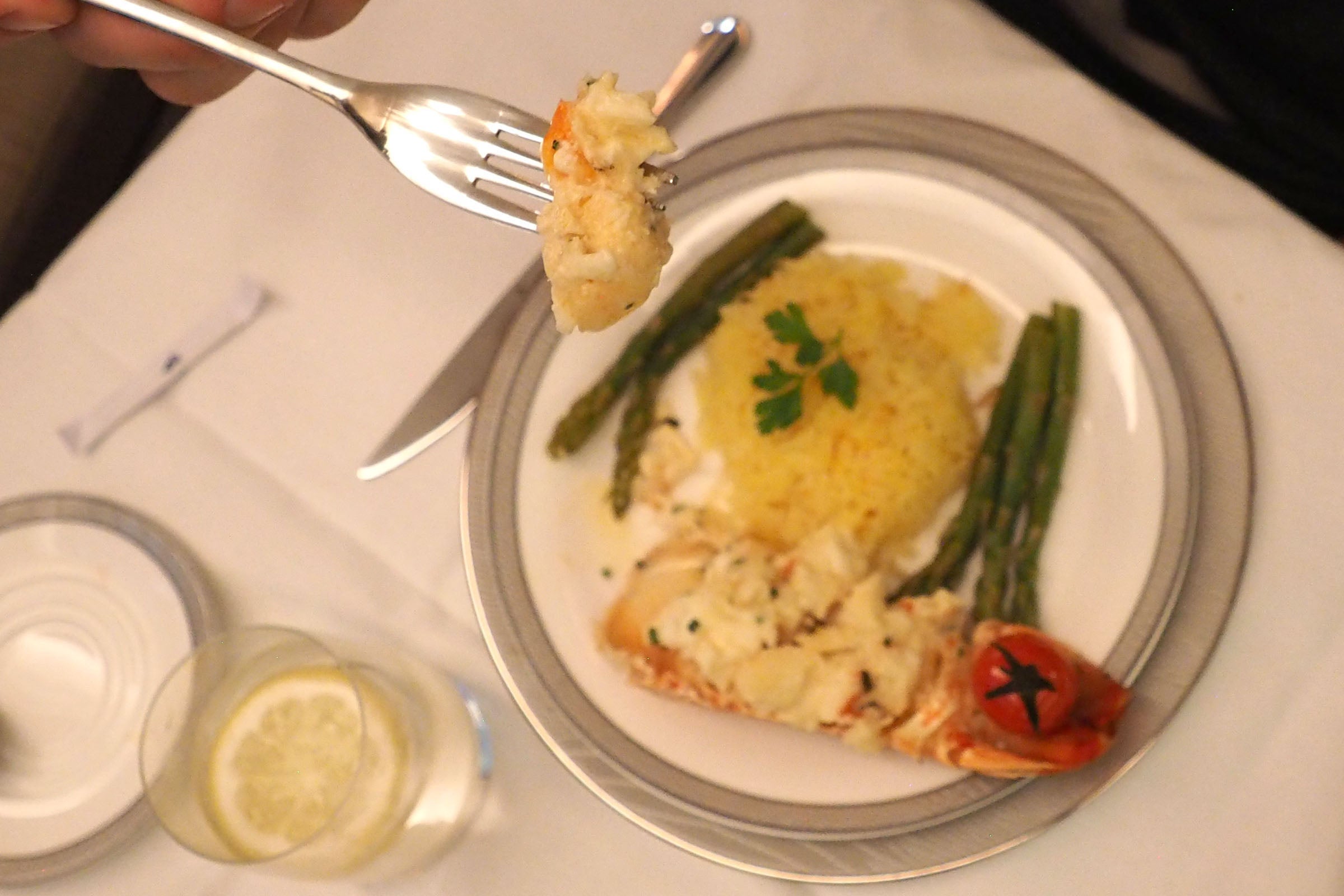 For my entree, I usually opt for Book the Cook, and this flight was no exception. I selected the lobster thermidor so that we could compare it to Zach's seafood thermidor in biz.