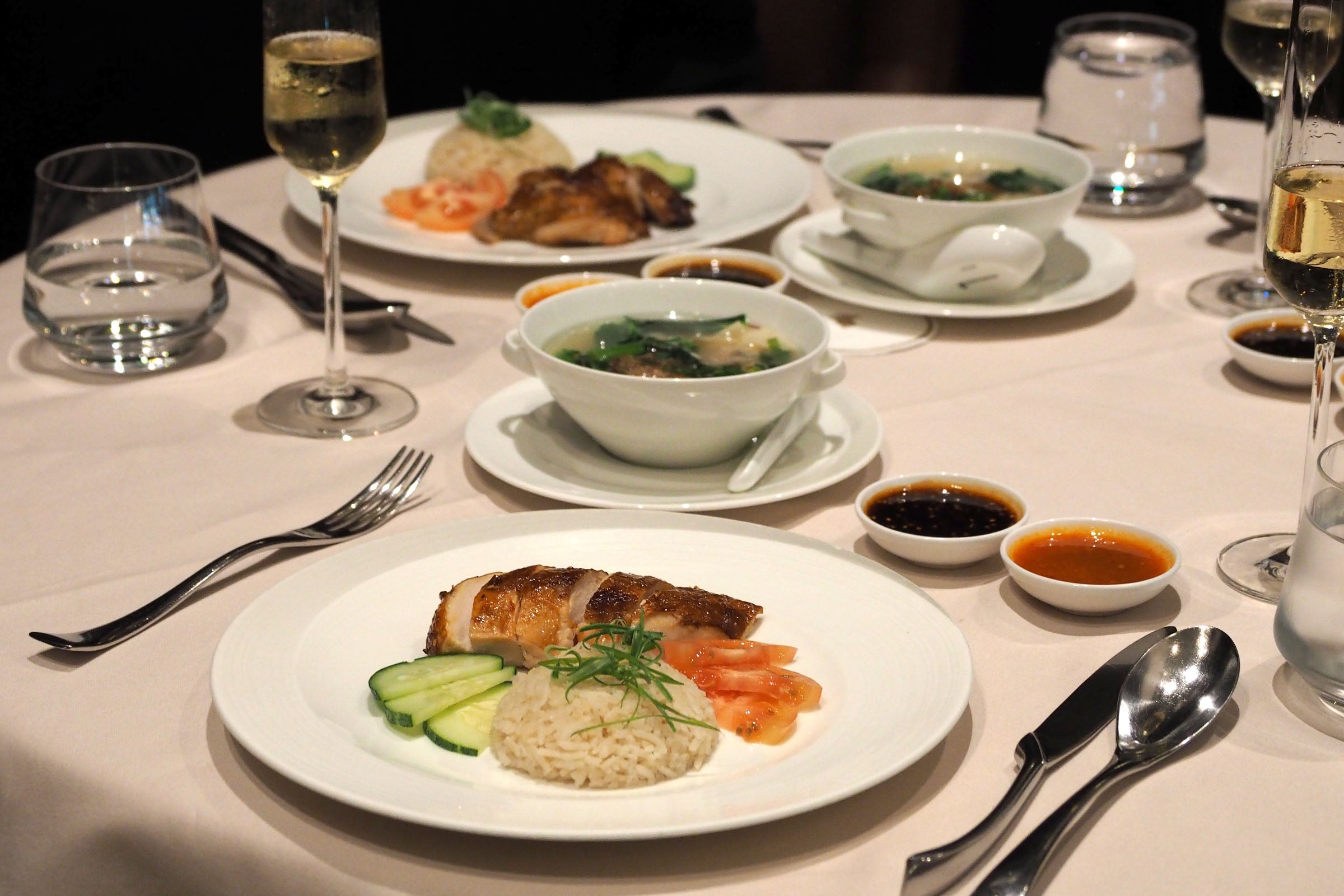 All were quite tasty, including the Yusheng salad, dim sum basket and chicken rice (pictured below). I also enjoyed a glass of Dom.