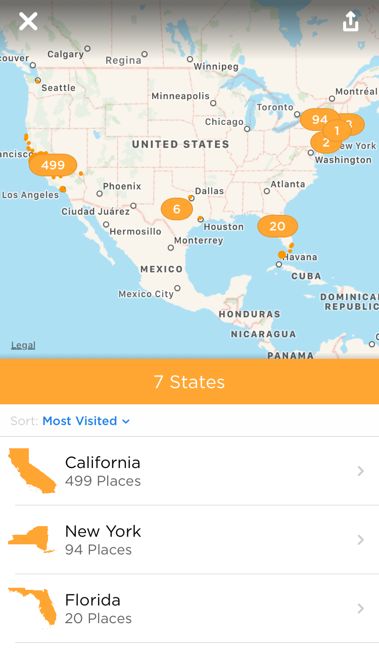 Finally, Swarm's core feature is located in this interactive map. Since February, I've visited seven states and the bulk of my trips have been in California and New York — which makes sense, considering I currently attend college in the San Francisco Bay Area and have spent the summer working in Manhattan.