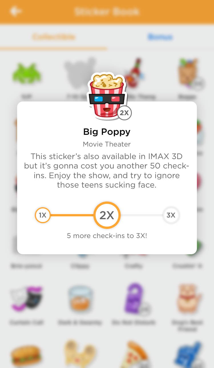 "Big Poppy" is an example of a collectible virtual sticker that I earned by checking into a movie theater. If you visit a movie theater 50 times, for instance, it turns into an IMAX 3-D version of the sticker — although there isn't a practical reason to do this other than for your own enjoyment.