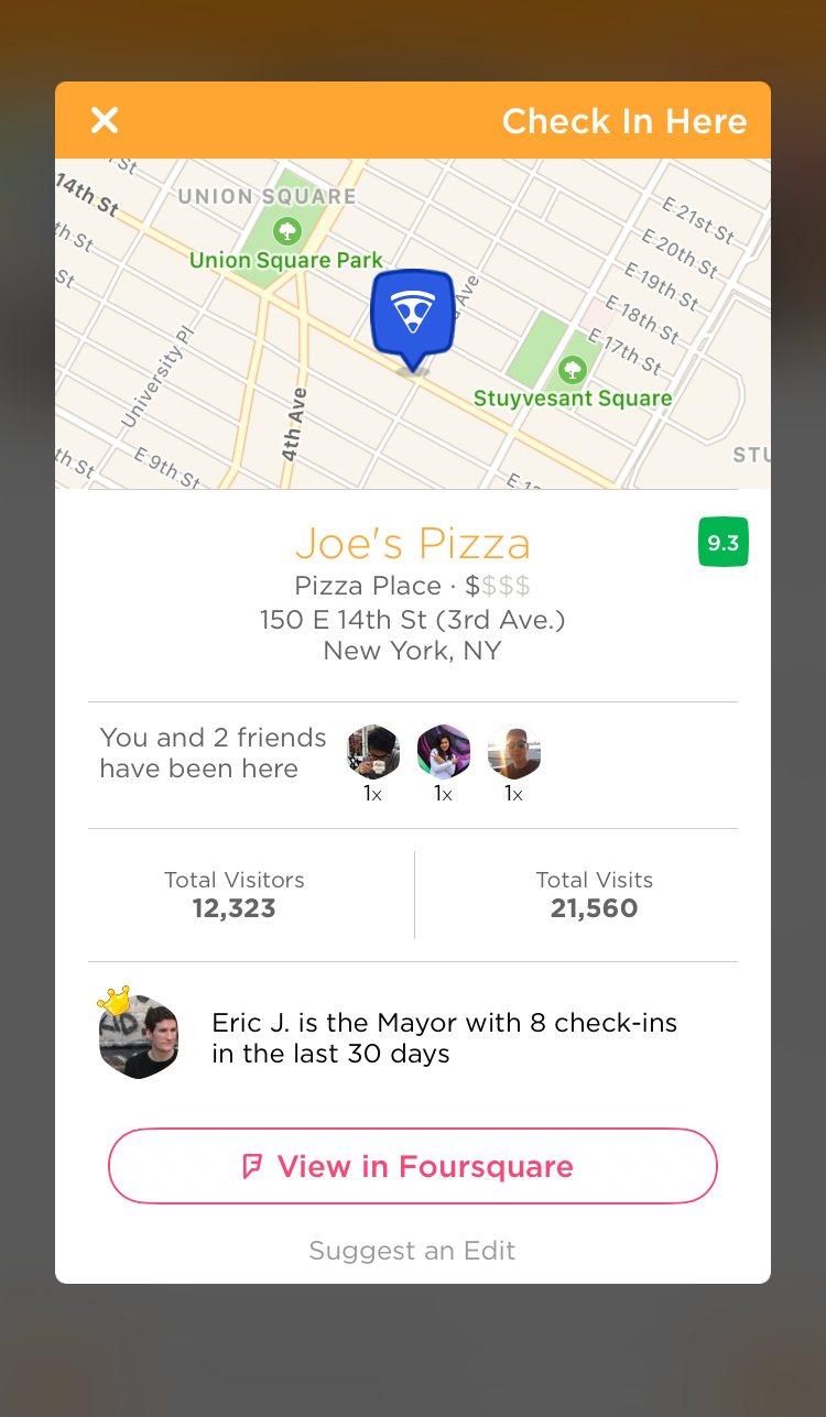 If you're checking in, this feature provides the option of viewing a location's rating on Foursquare, the amount of visitors that have stopped by with the app and who the "Mayor" is — the person who has visited that place the most in the last 30 days.